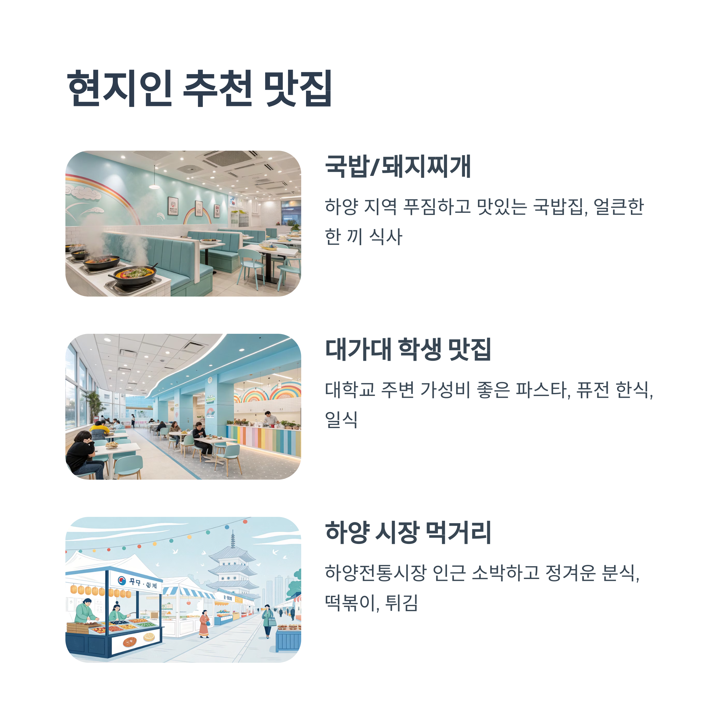 - 국밥/돼지찌개: 하양 지역은 푸짐하고 맛있는 국밥집이나 돼지찌개 전문점들이 많습니다. 얼큰하고 든든한 한 끼 식사로 현지인들에게 인기가 많습니다.