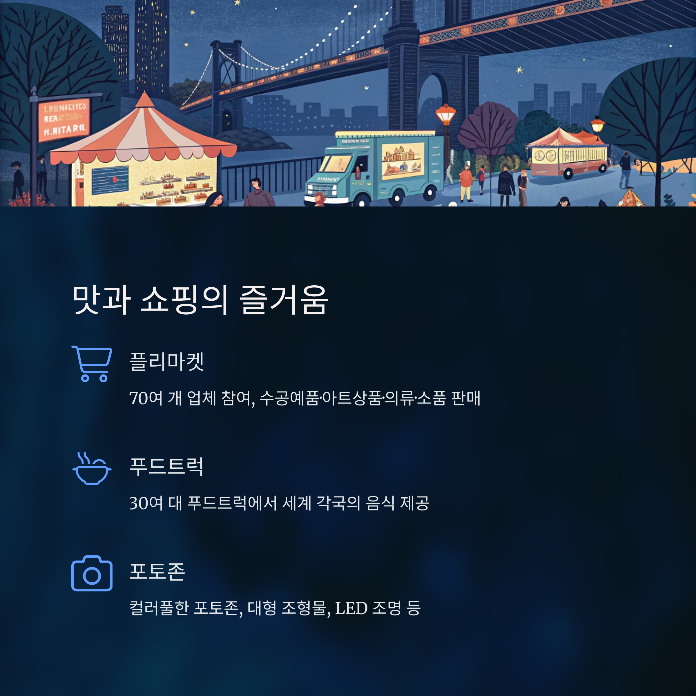 - 플리마켓: 70여 개 업체가 참여, 수공예품·아트상품·의류·소품 등 판매
