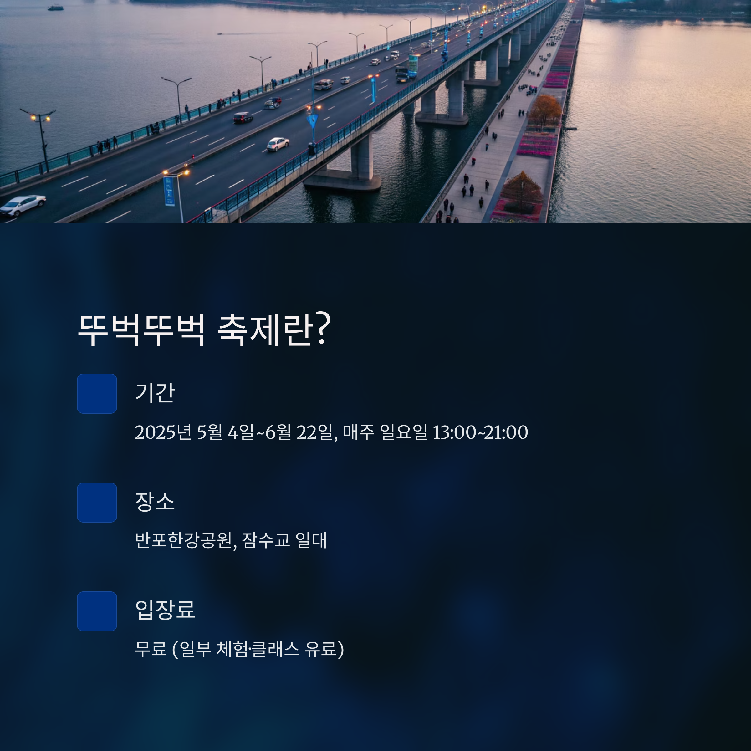 - 잠수교 라이브: 인디밴드, 버스킹, 거리공연 등 다양한 음악 공연