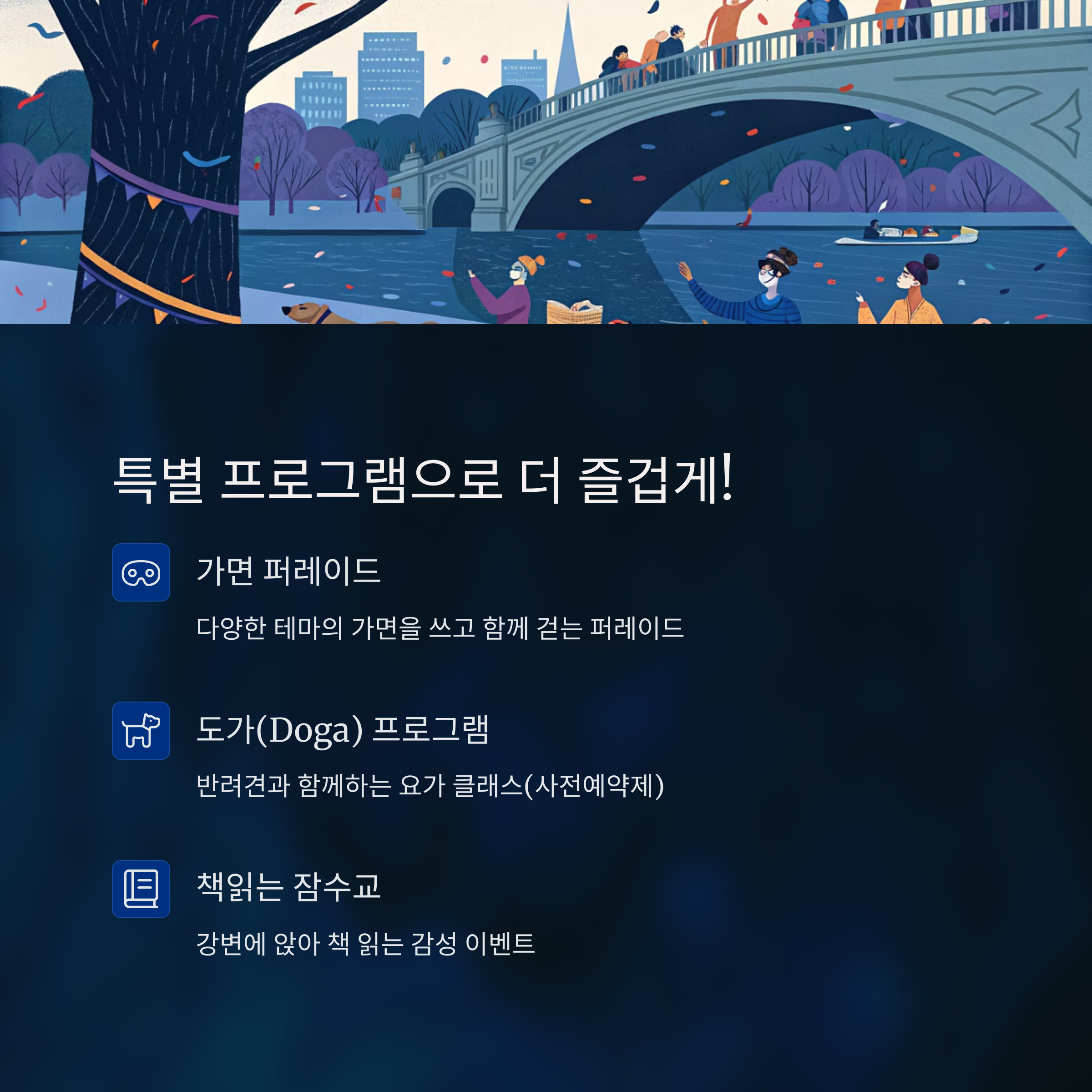 - 차 없는 잠수교: 평소엔 차량 전용, 축제 때만 보행자 전용으로 완전 개방