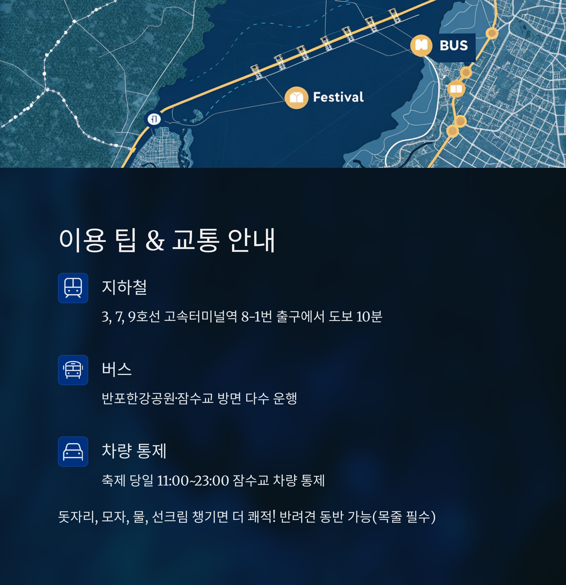 - 차량 통제: 축제 당일 11:00~23:00 잠수교 차량 통제(남단 회전교차로는 정상 운영)