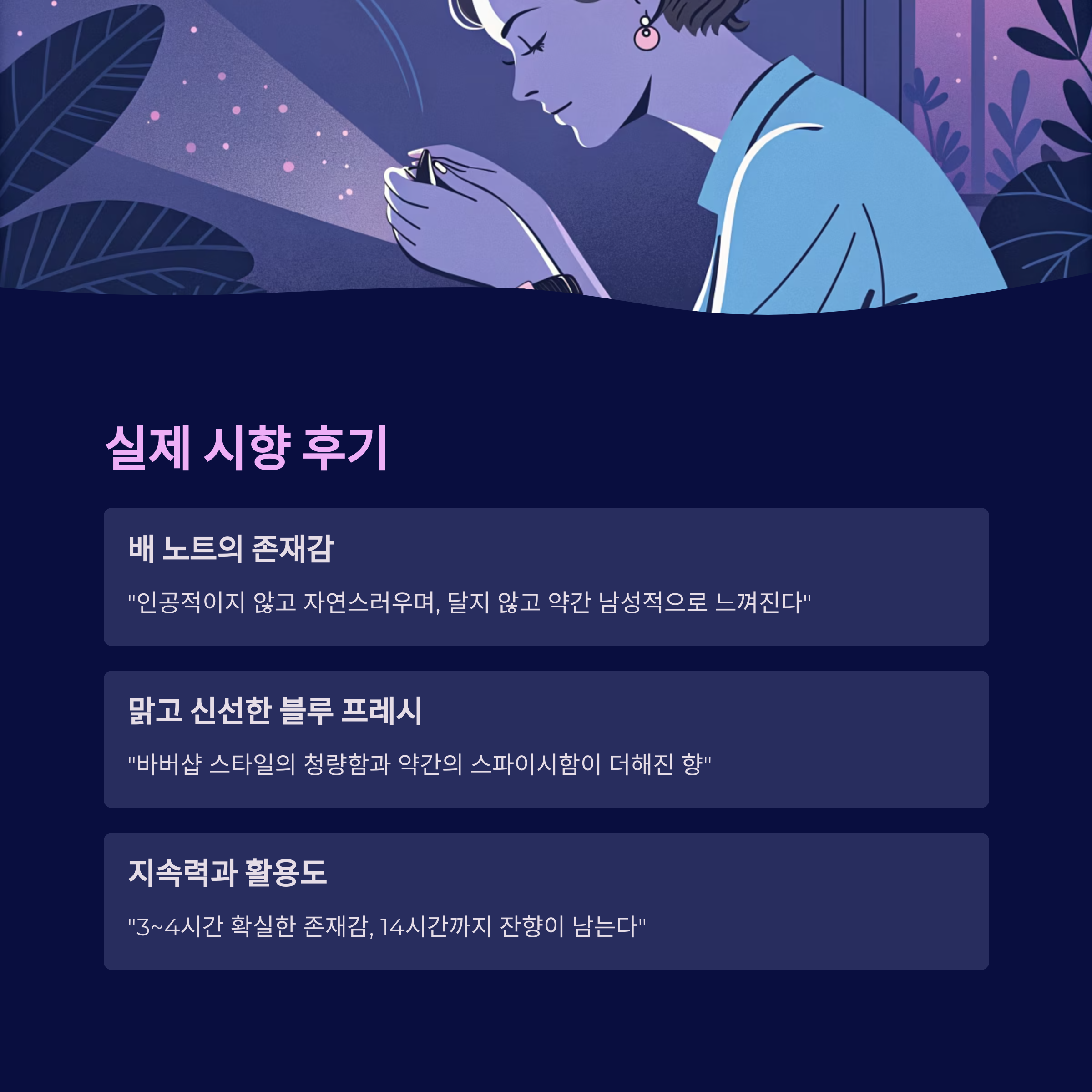 - 고급 니치향수다운 특별함: “라이트한 단맛+시원 상큼함, 누구나 호불호 적게 쓸 수 있는 향”, “내 주변에 감싸는 듯한 은은함, 독하지 않고 고급스럽다”, “블루 계열 향수 중 손꼽히는 완성도”