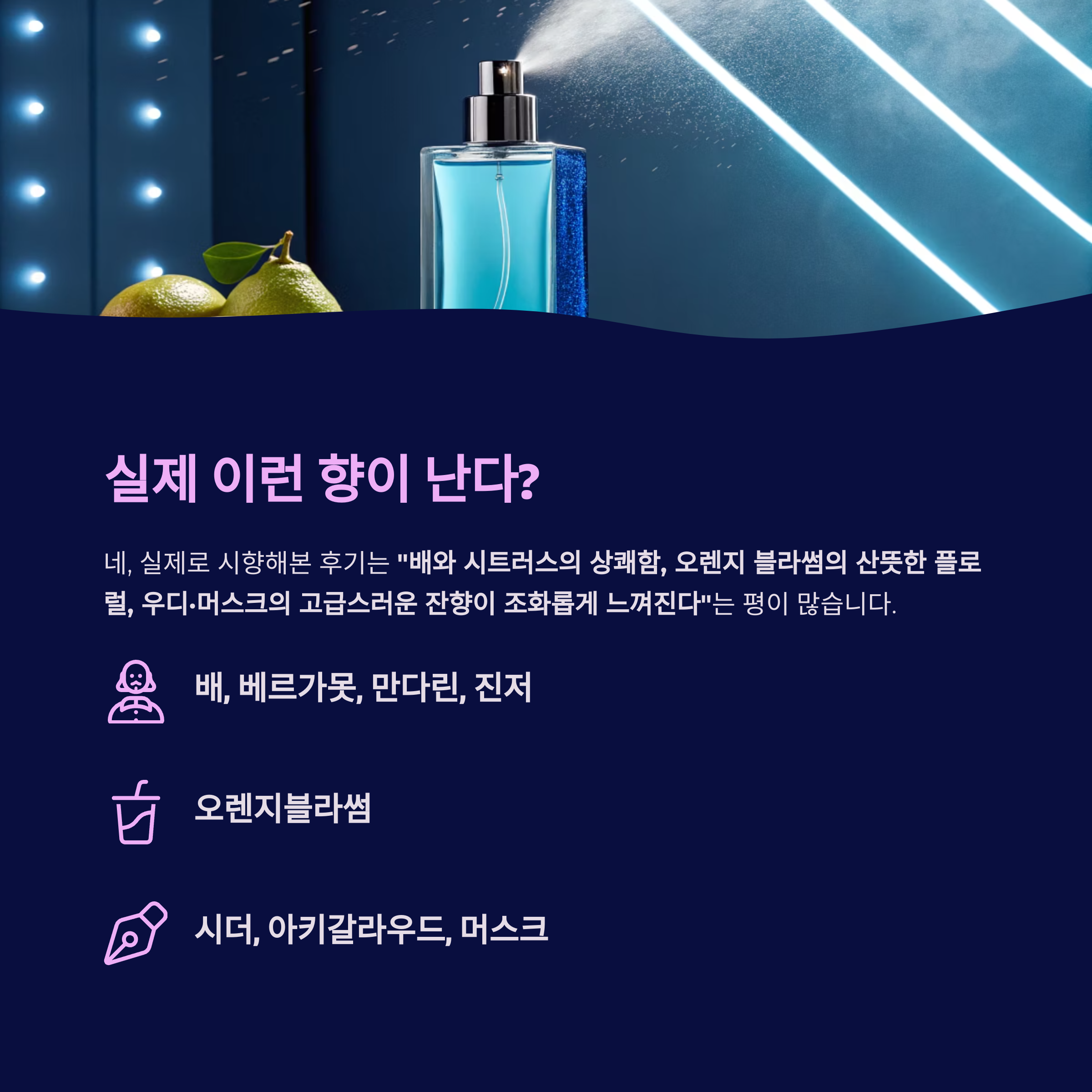 네, 실제로 시향해본 후기는 대부분 "배와 시트러스의 상쾌함, 오렌지 블라썸의 산뜻한 플로럴, 우디·머스크의 고급스러운 잔향이 조화롭게 느껴진다"는 평이 많습니다.