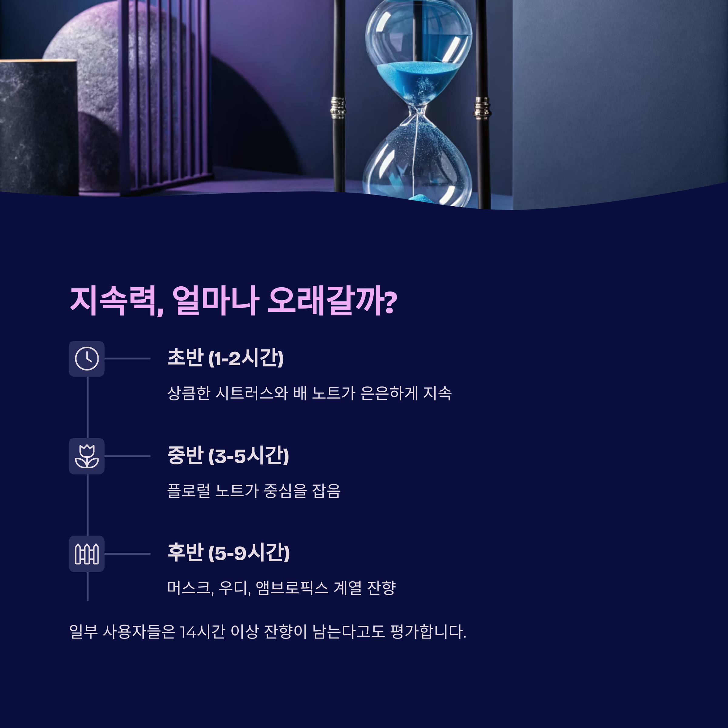 - 잔향: 부드럽고 고급스러운 머스크·우디·앰버 잔향이 오래 남아, 5~9시간 이상 지속력에 만족하는 편