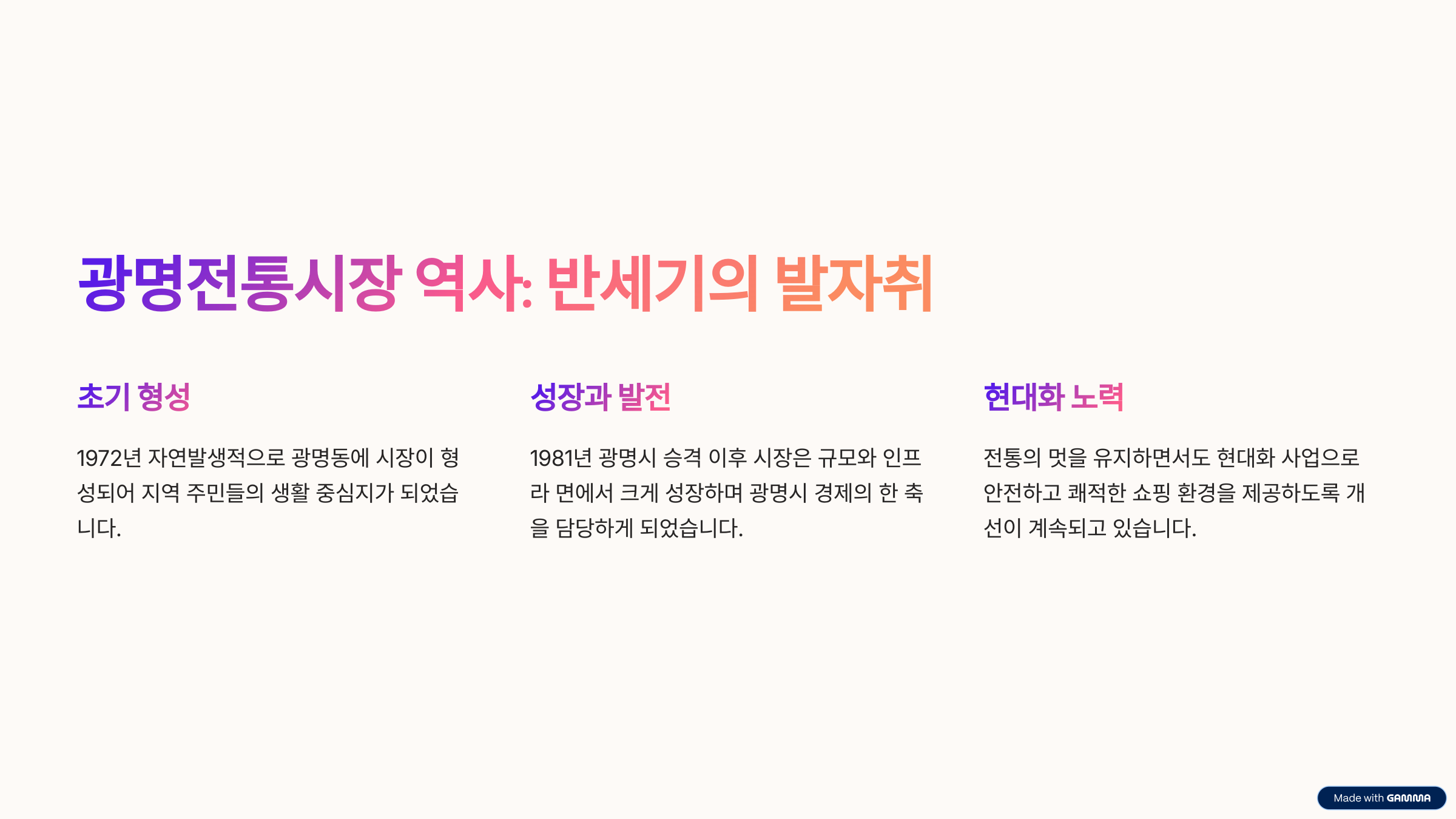 1970년대 시흥군 광명리 시절 자연발생적으로 형성된 재래시장. 1981년 광명시 승격과 도시 개발로 빠르게 성장했고, 1995년 대형 화재 후 아케이드와 현대식 시설로 재정비되어 지금은 약 19,000㎡ 부지에 400여 점포가 모인 광명 최대 규모의 전통시장으로 자리잡았습니다.