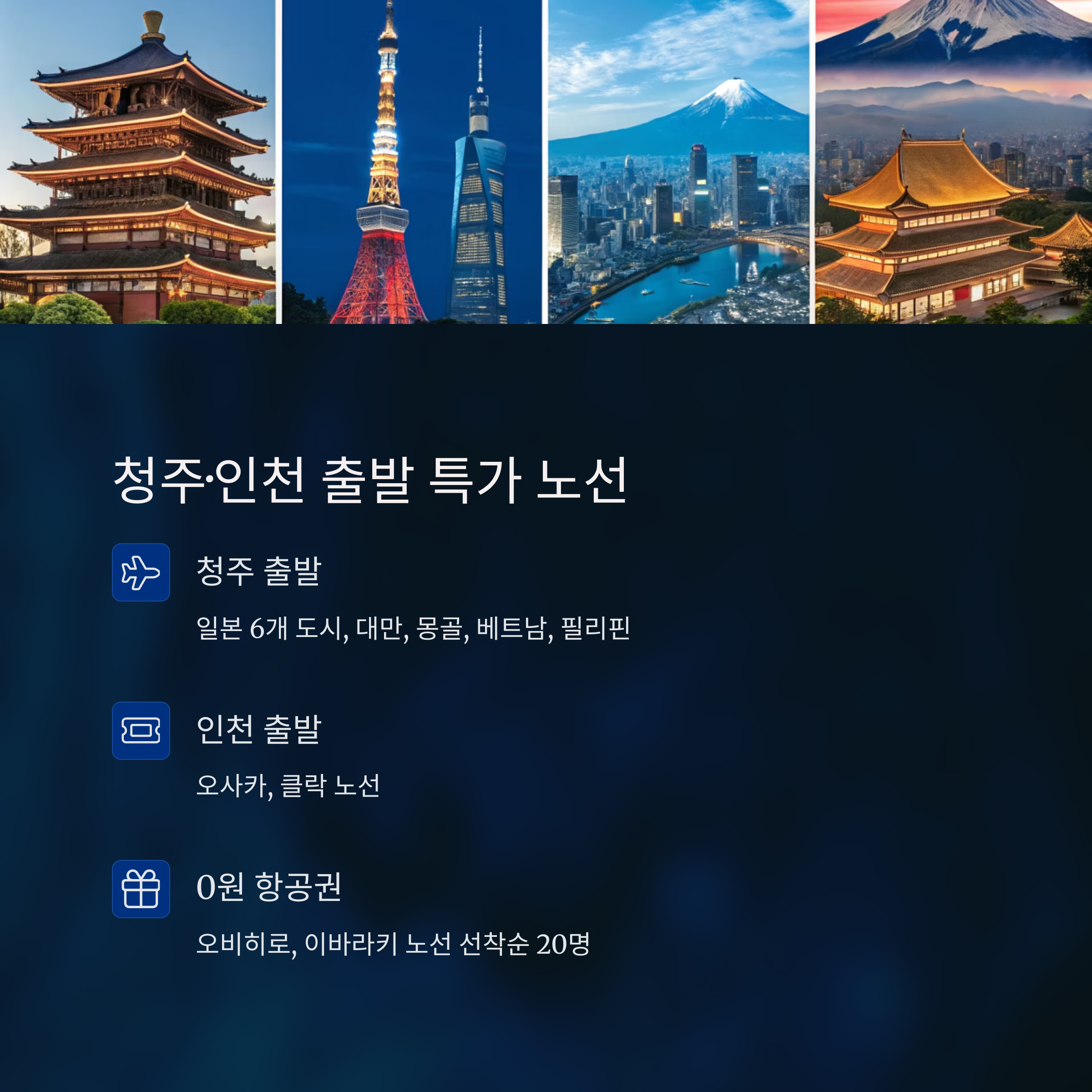 - 특별 노선 0원 항공권: 일부 노선(예: 홋카이도 오비히로, 이바라키 등)은 선착순 20~30명에게 0원 항공권(유류할증료 및 공항세 별도)이 제공됩니다.