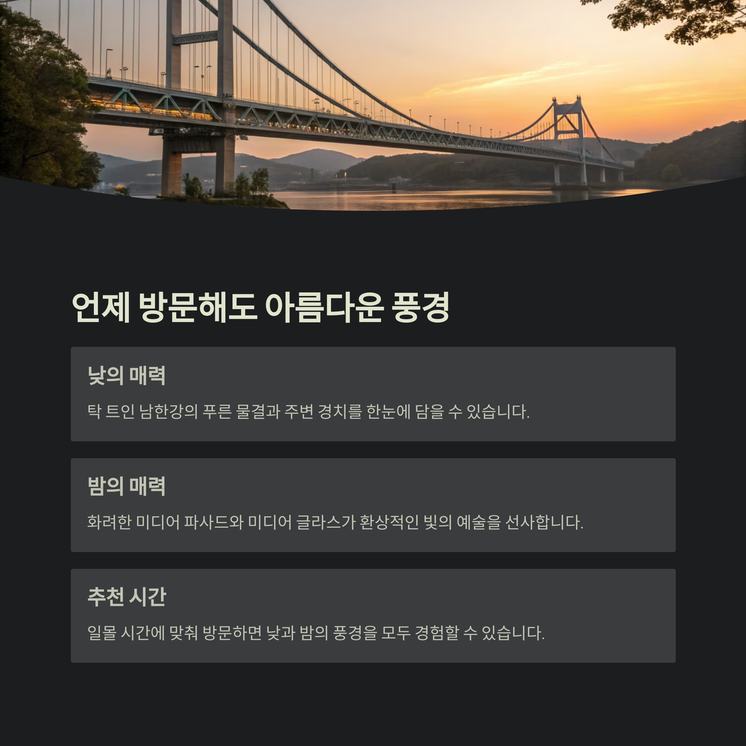 여주 남한강 출렁다리는 계절과 상관없이 아름다운 풍경을 선사합니다. 낮에는 탁 트인 강변 풍경을, 밤에는 빛의 예술을 감상할 수 있어 언제 방문해도 좋습니다. 특히 일몰 시간에 맞춰 방문하면 낮과 밤의 풍경을 모두 경험할 수 있어 더욱 추천됩니다.