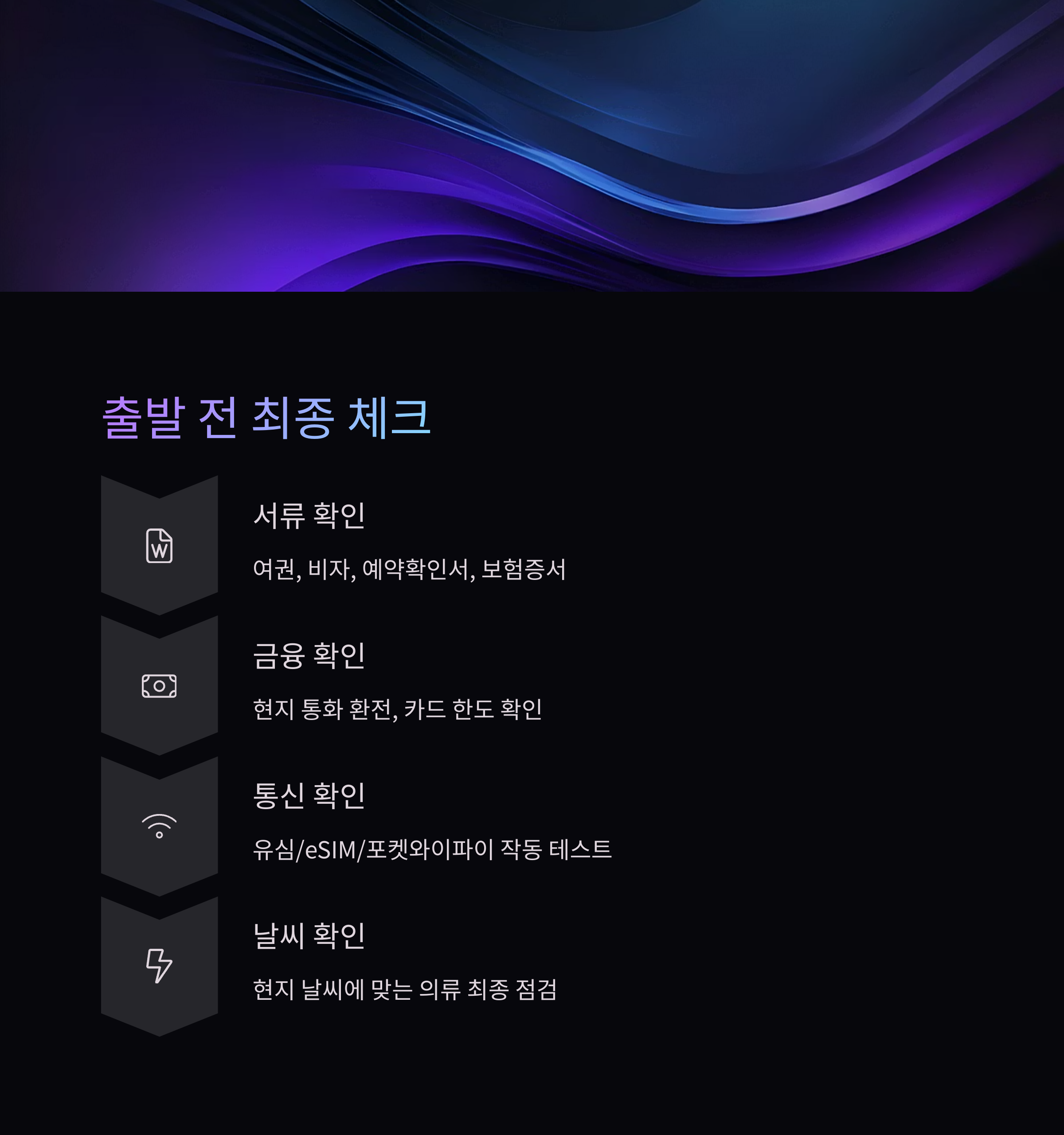 팁: 여권, 보험, 예약서류 등은 클라우드(이메일, 구글드라이브)에 미리 저장해 두세요.