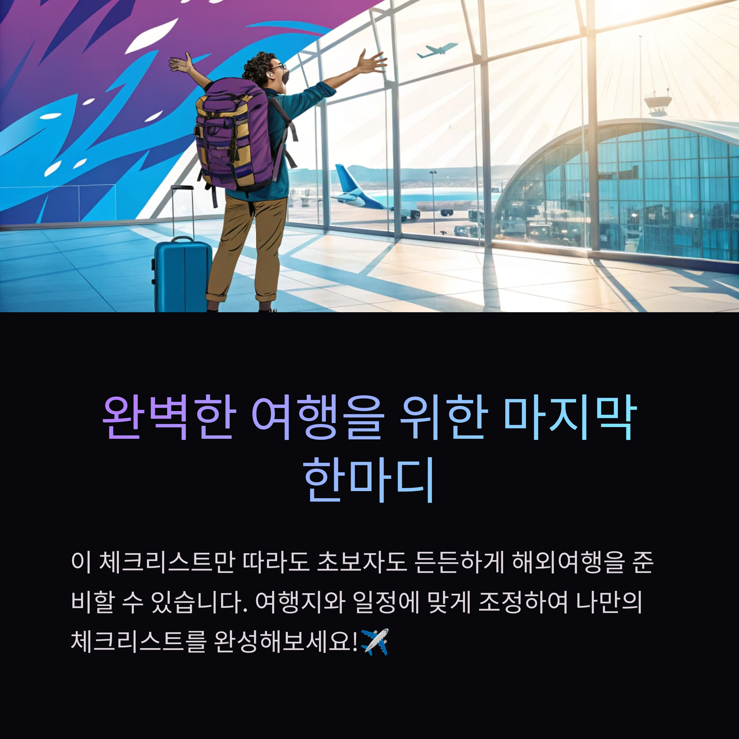 이 체크리스트만 따라도 초보자도 든든하게 해외여행을 준비할 수 있습니다. 여행지, 일정, 개인 스타일에 따라 필요한 항목을 추가하거나 빼면 더욱 완벽한 준비가 됩니다!