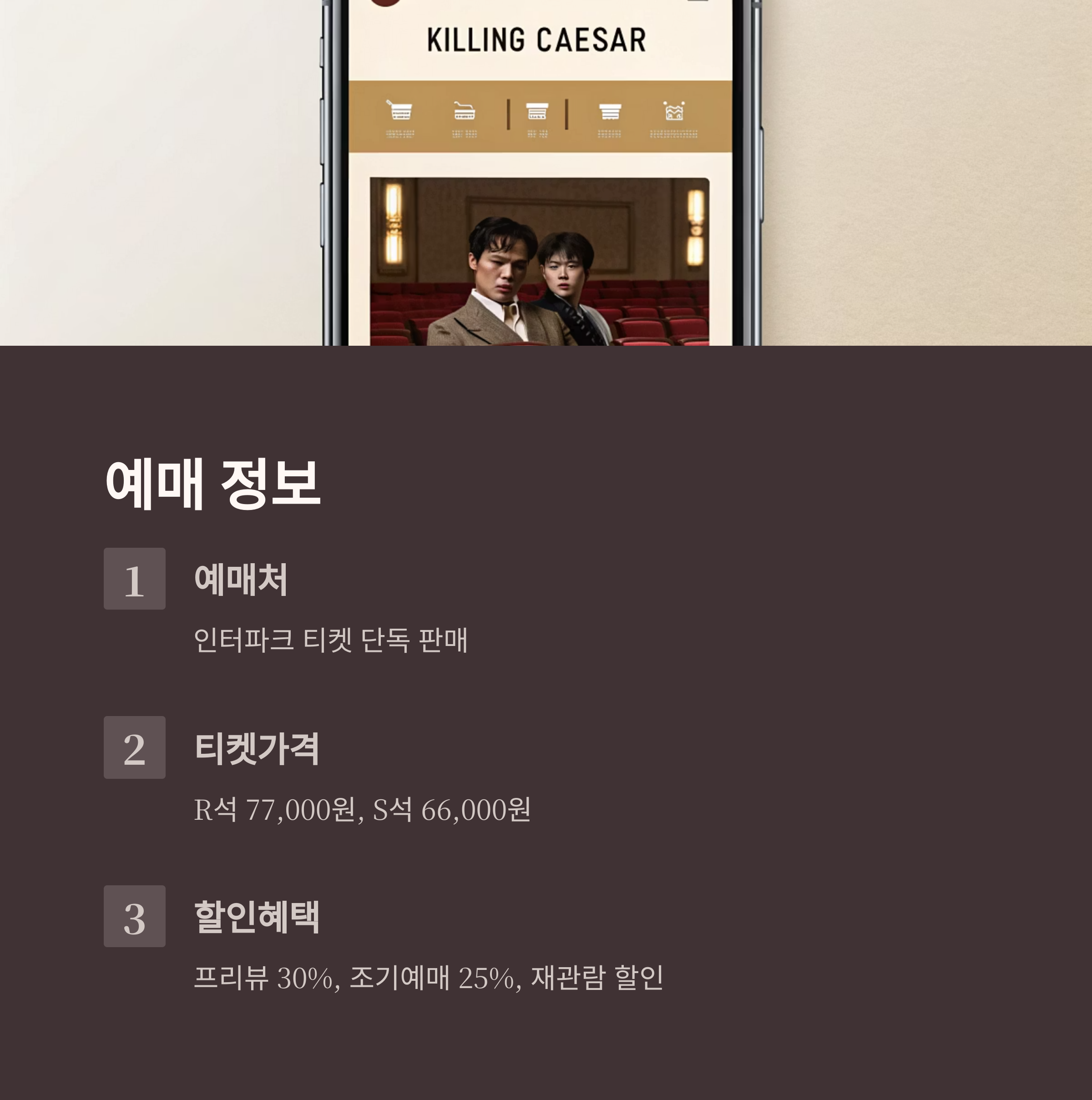 연극 ‘킬링시저’는 셰익스피어의 ‘줄리어스 시저’를 현대적으로 각색해 권력, 정의, 배신의 아이러니를 강렬하게 그려냅니다. 김준원, 손호준, 양지원, 유승호 등 화려한 배우진, 100분간의 몰입도 높은 무대, 인터파크 단독 예매와 다양한 할인 혜택까지, 2025년 상반기 대학로 최고의 화제작입니다.