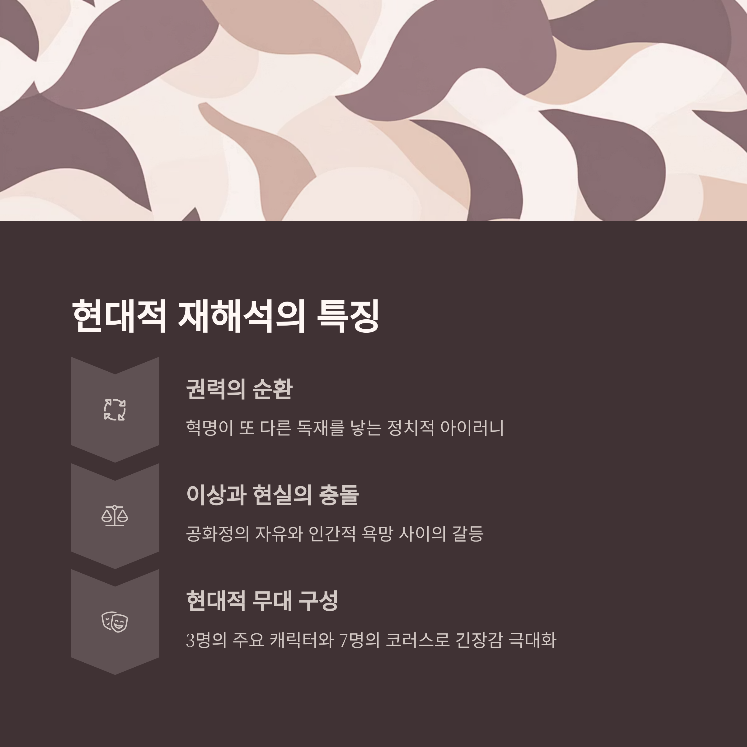 기존의 대규모 인물 대신 단 세 명의 주요 캐릭터와 7명의 코러스가 다양한 인물과 상황을 연기하는 새로운 무대 형식을 도입했습니다. 이 코러스는 다양한 민중의 목소리, 상황의 변화, 내면의 갈등까지 입체적으로 표현해 현대극의 긴장감과 속도감을 높입니다. - 현대적 연출과 각색
