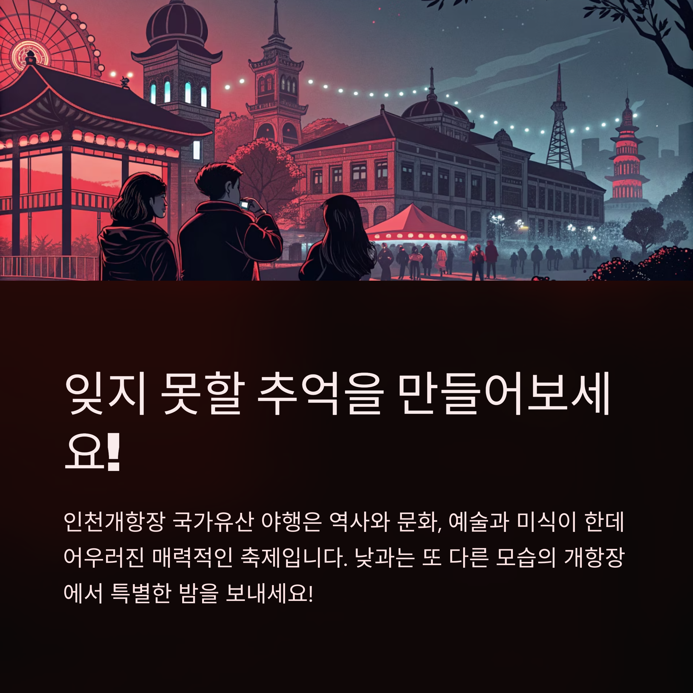 인천개항장 국가유산 야행은 역사와 문화, 예술과 미식이 한데 어우러진 매력적인 축제입니다. 낮과는 또 다른 모습의 개항장에서 특별한 밤을 보내고, 잊지 못할 추억을 만들어보세요! 🌌😊