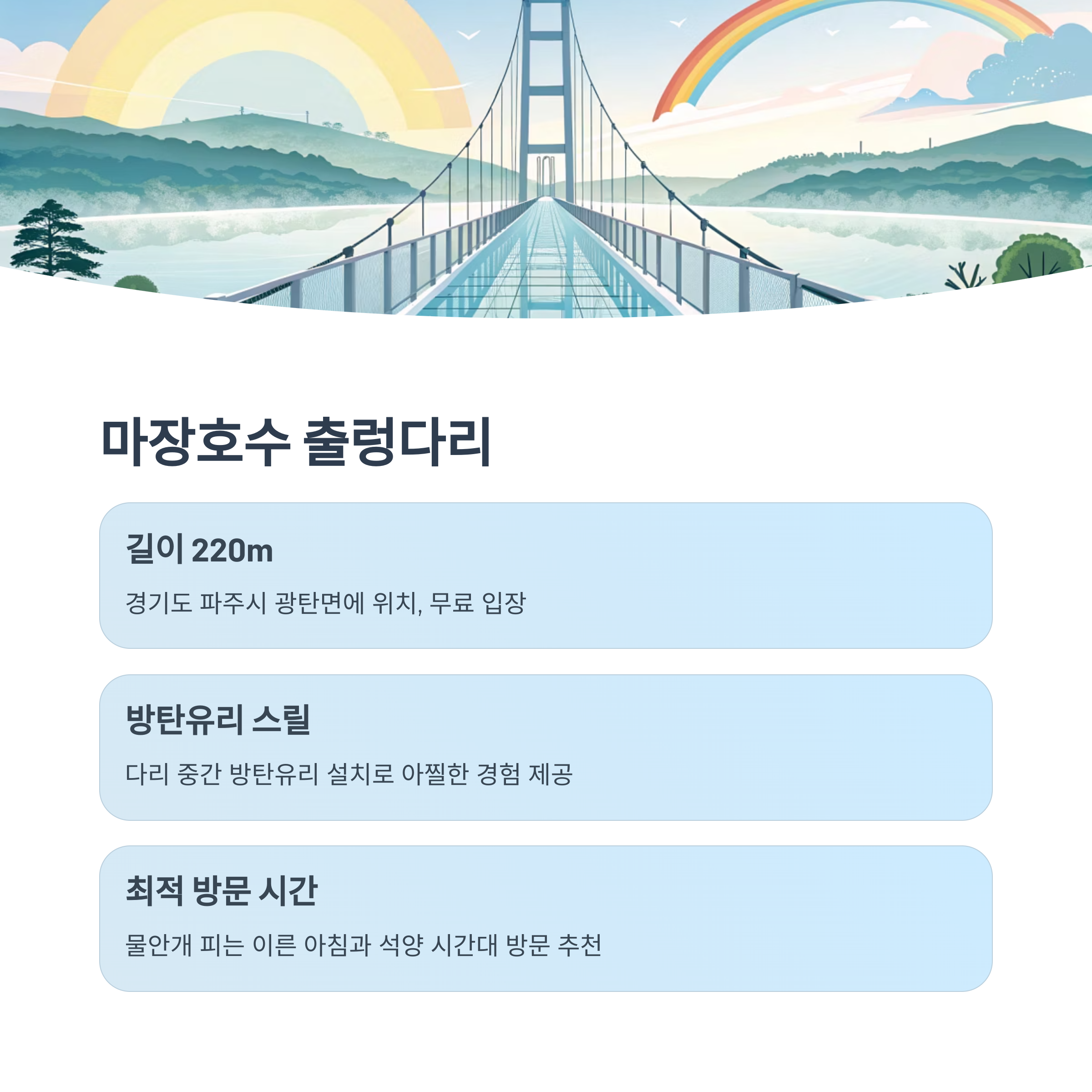 - 인기 및 후기: 흔들림 적고 튼튼해 가족 단위 방문객에게 인기, 주변 둘레길 산책 가능