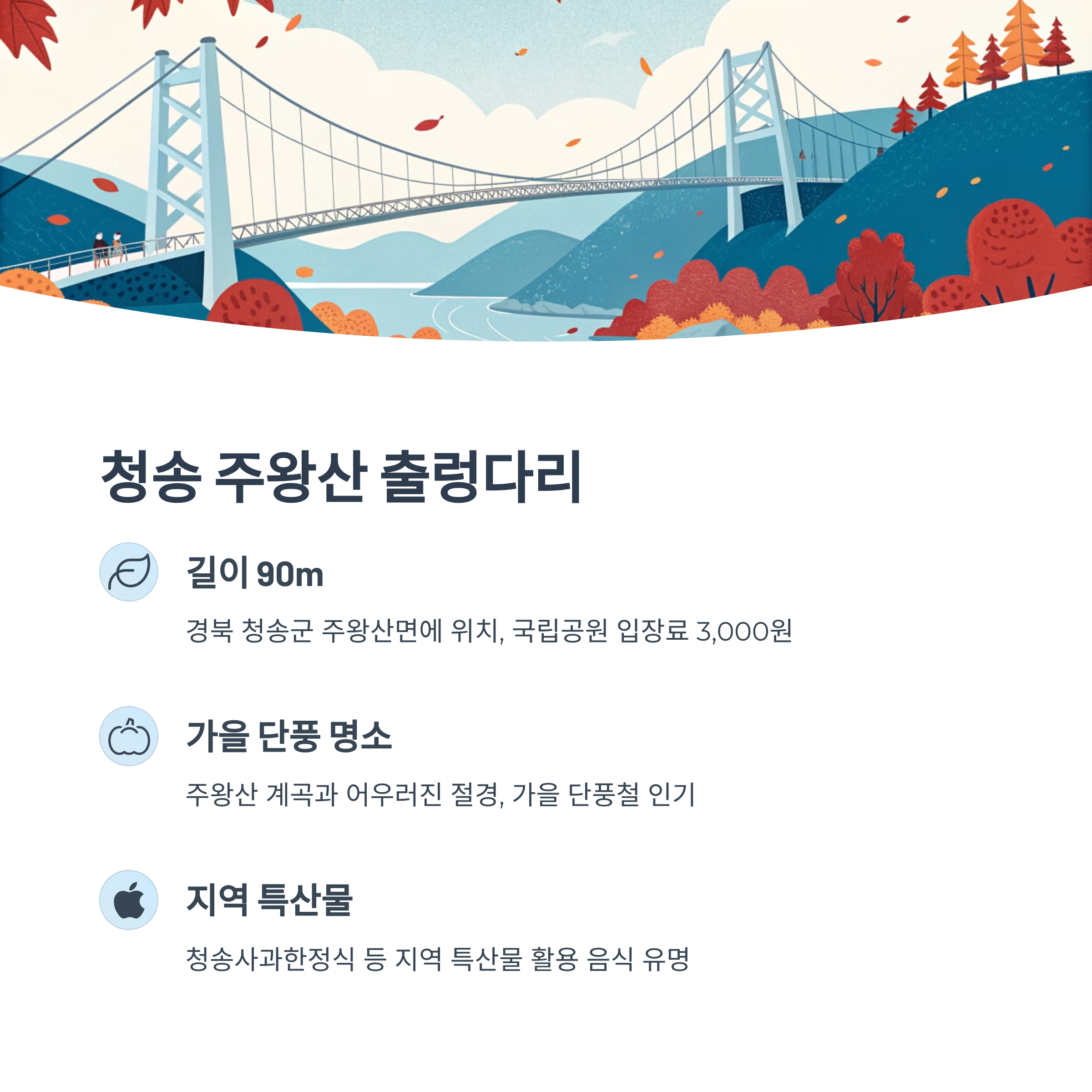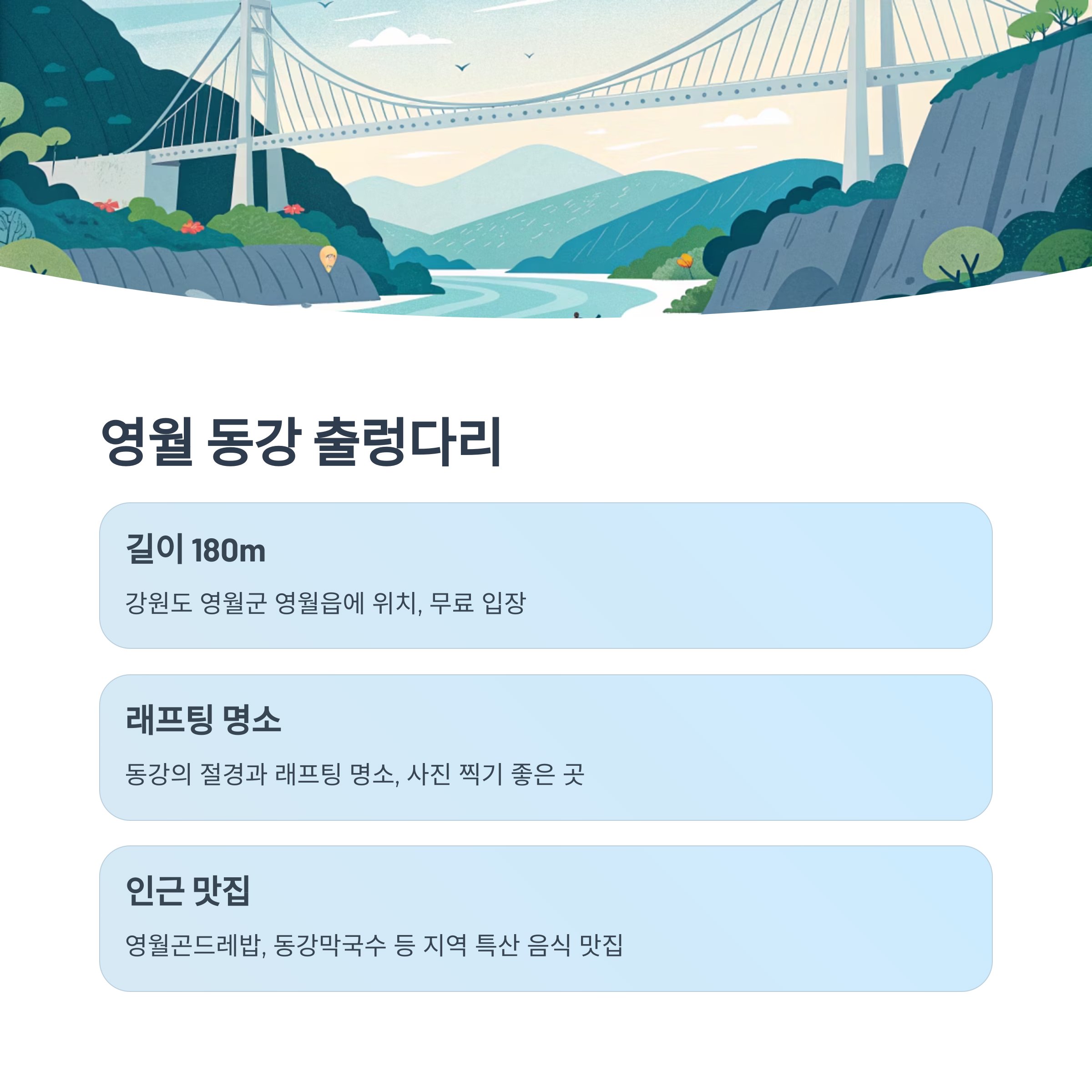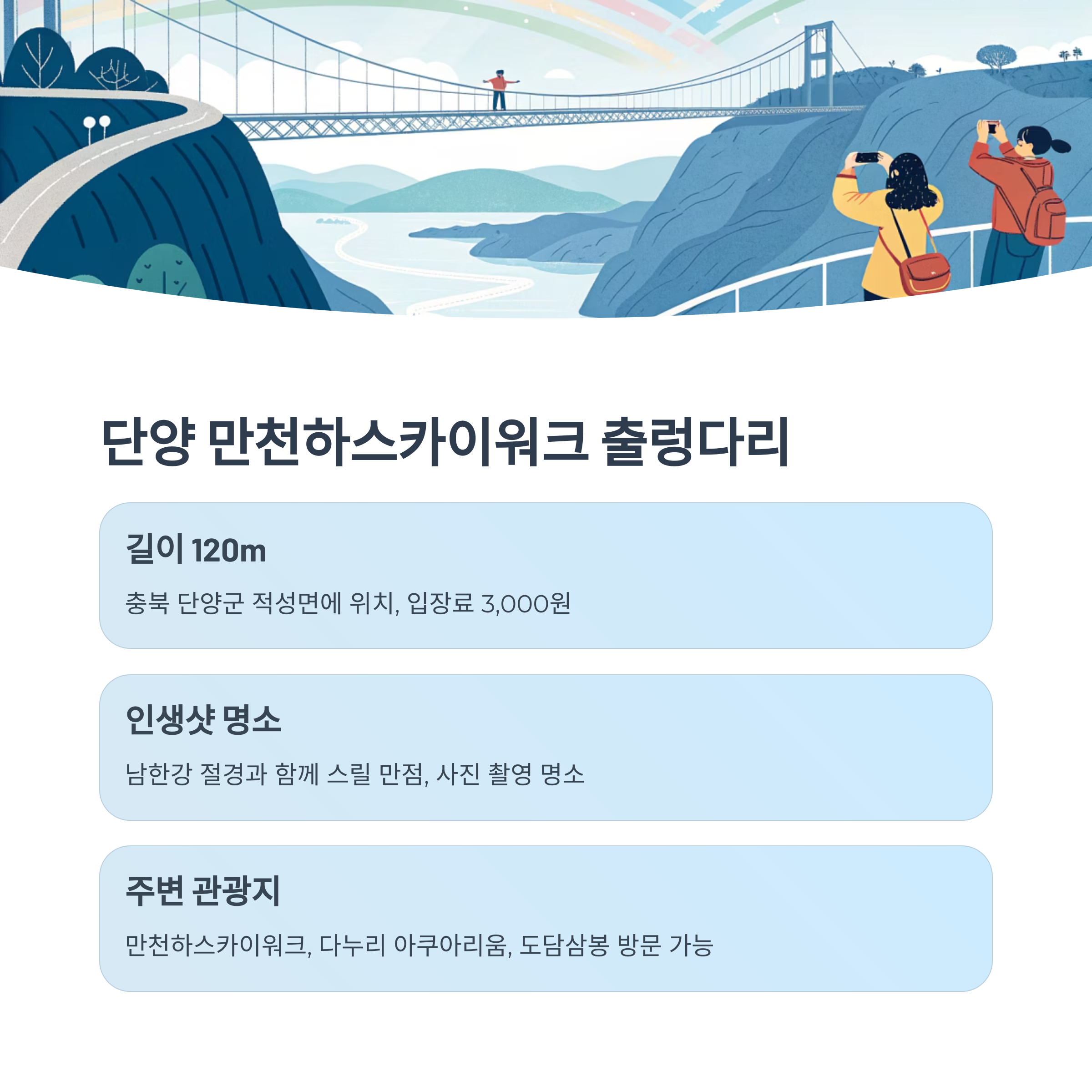 - 인기 및 후기: 스릴 넘치는 출렁다리로 추천되며 주변 자연경관 뛰어남