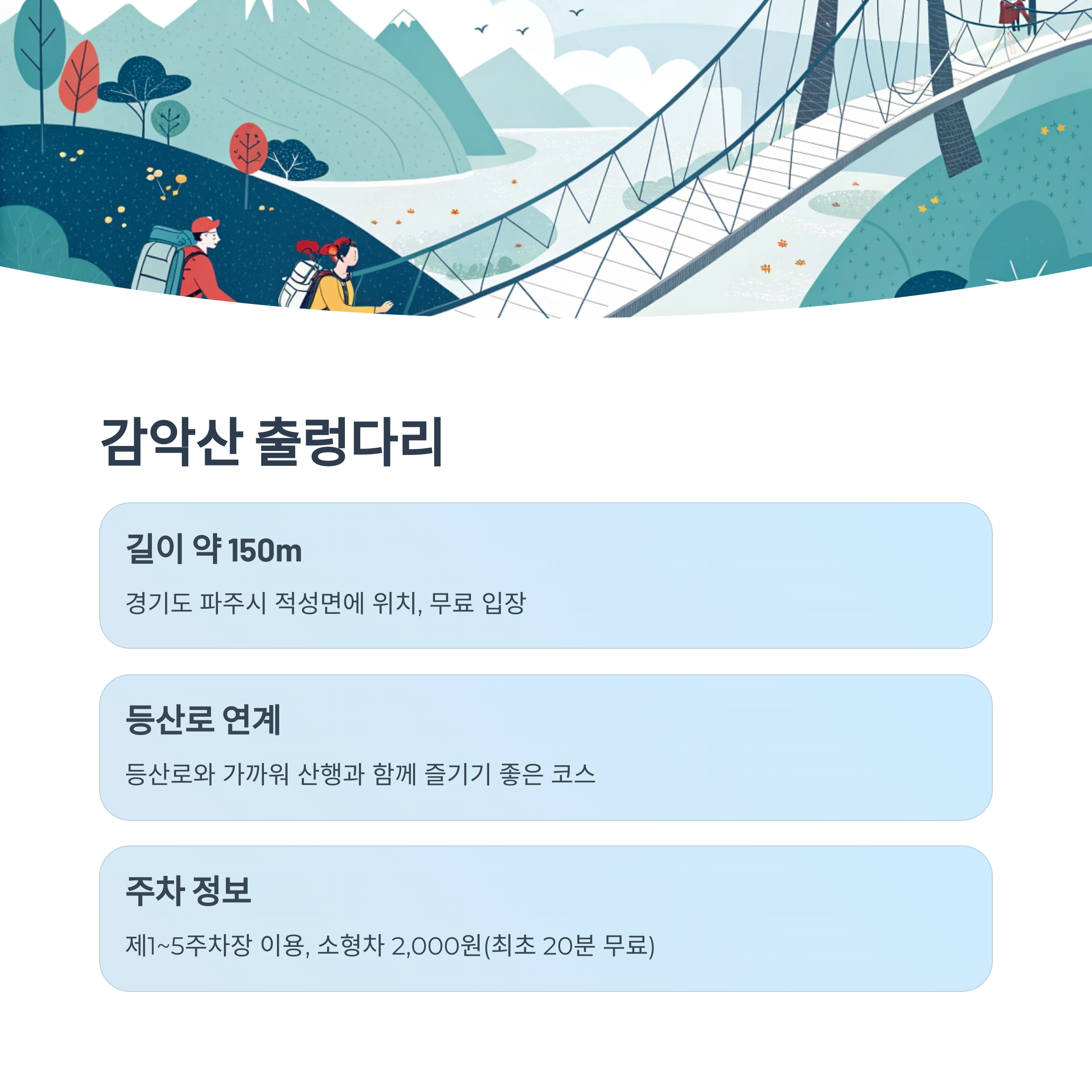 - 주차시설: 출렁다리 입구 앞 넓은 무료 주차장