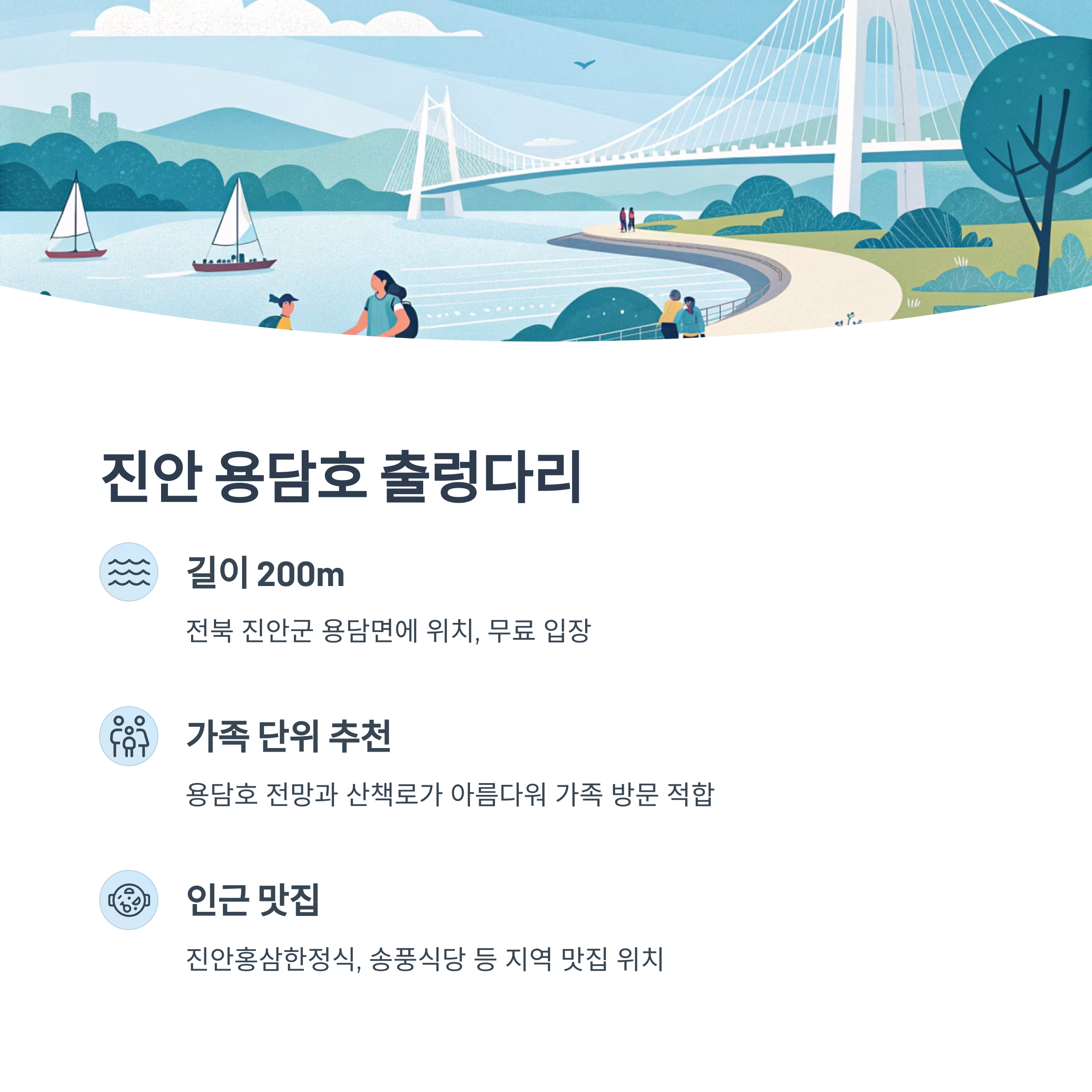 - 인기 및 후기: 용담호 전망과 산책로가 아름다워 가족 단위 추천