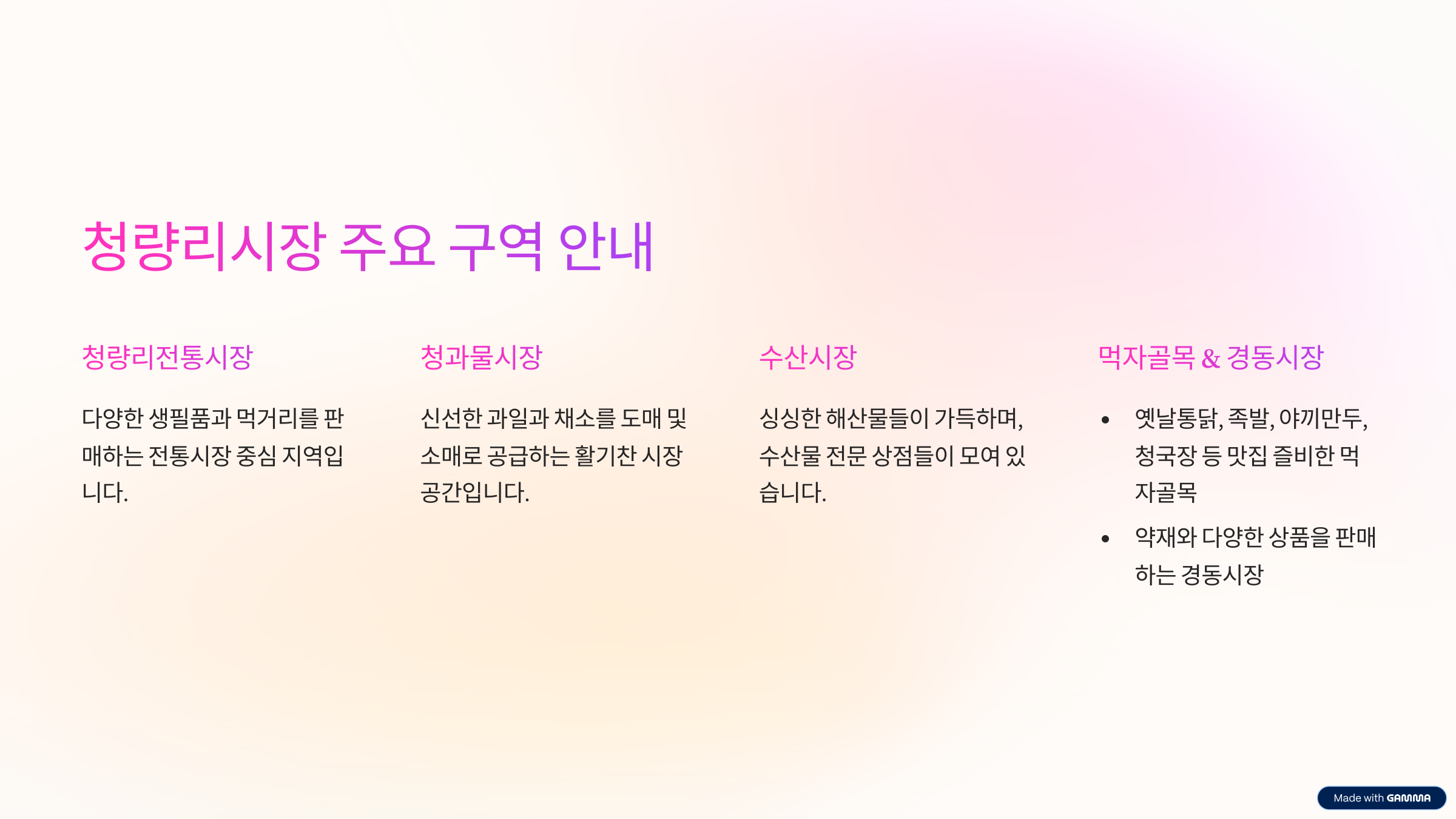 - 청량리전통시장의 역사와 다양한 먹거리, 위치 정보 등을 제공합니다.