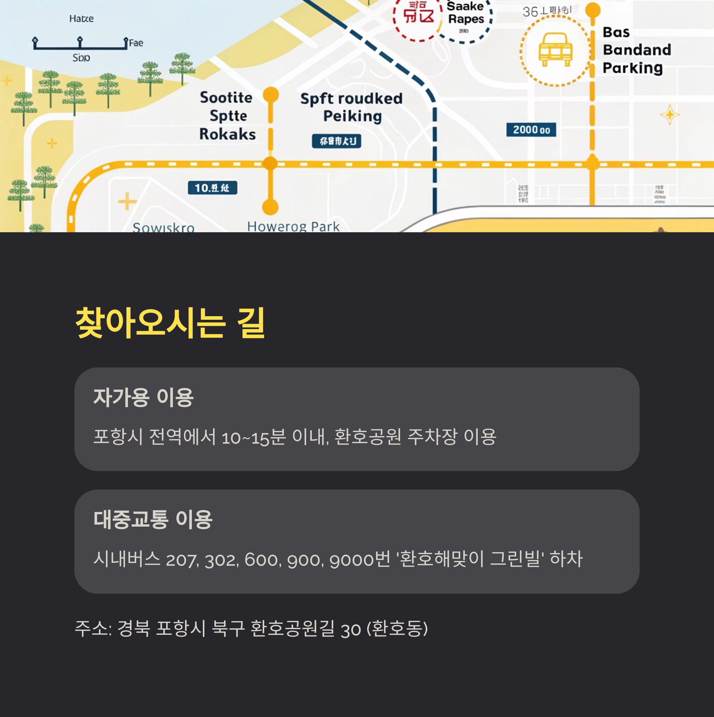 - 대중교통 이용 시: 시내버스 207, 302, 600, 900, 9000번을 이용한 후 '환호해맞이 그린빌' 정류장에서 하차하면 됩니다.