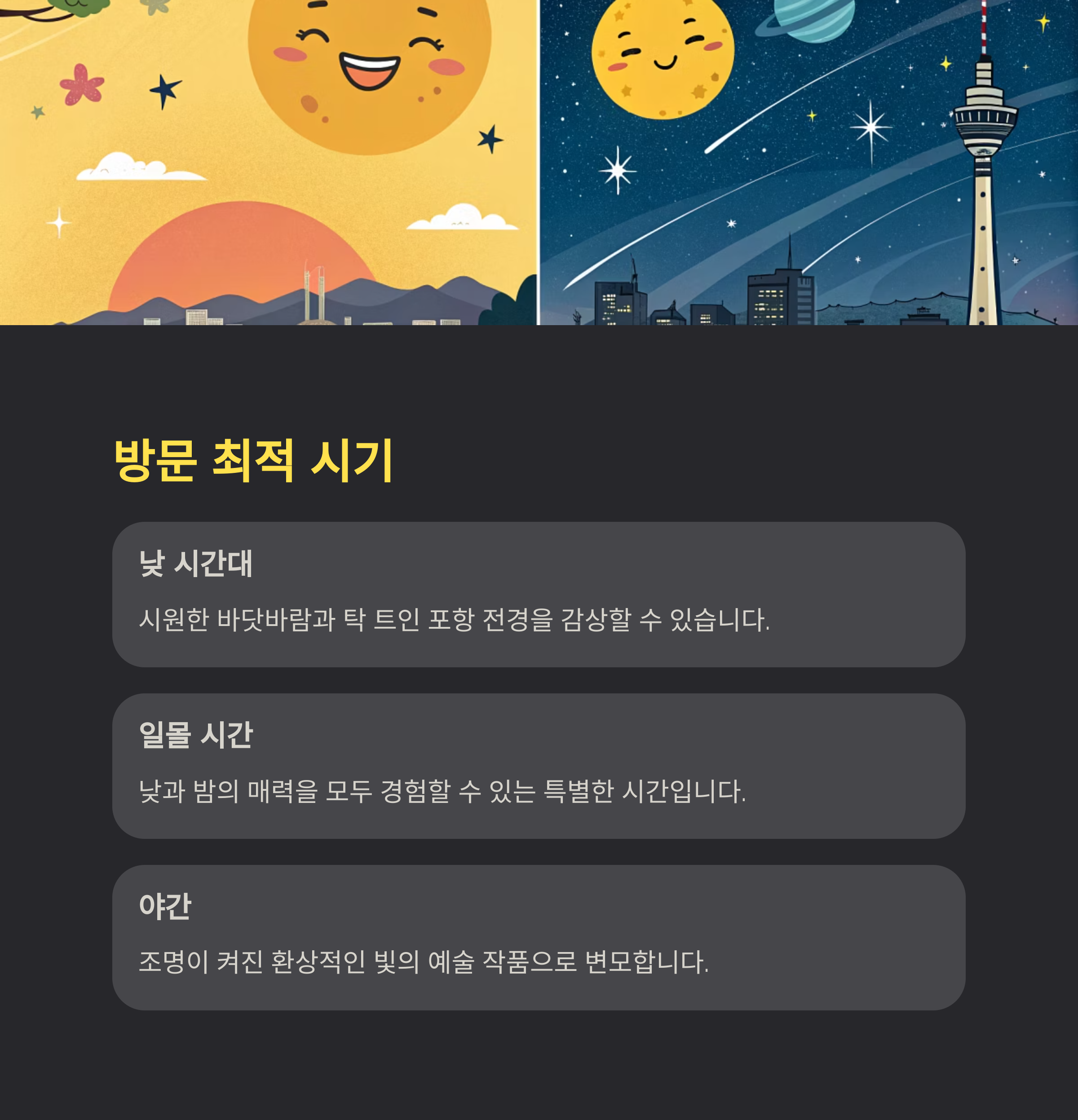 - 추천 방문 시기: 맑은 날 일몰 전후 방문하여 낮과 밤의 풍경을 모두 즐기는 것을 추천합니다.
