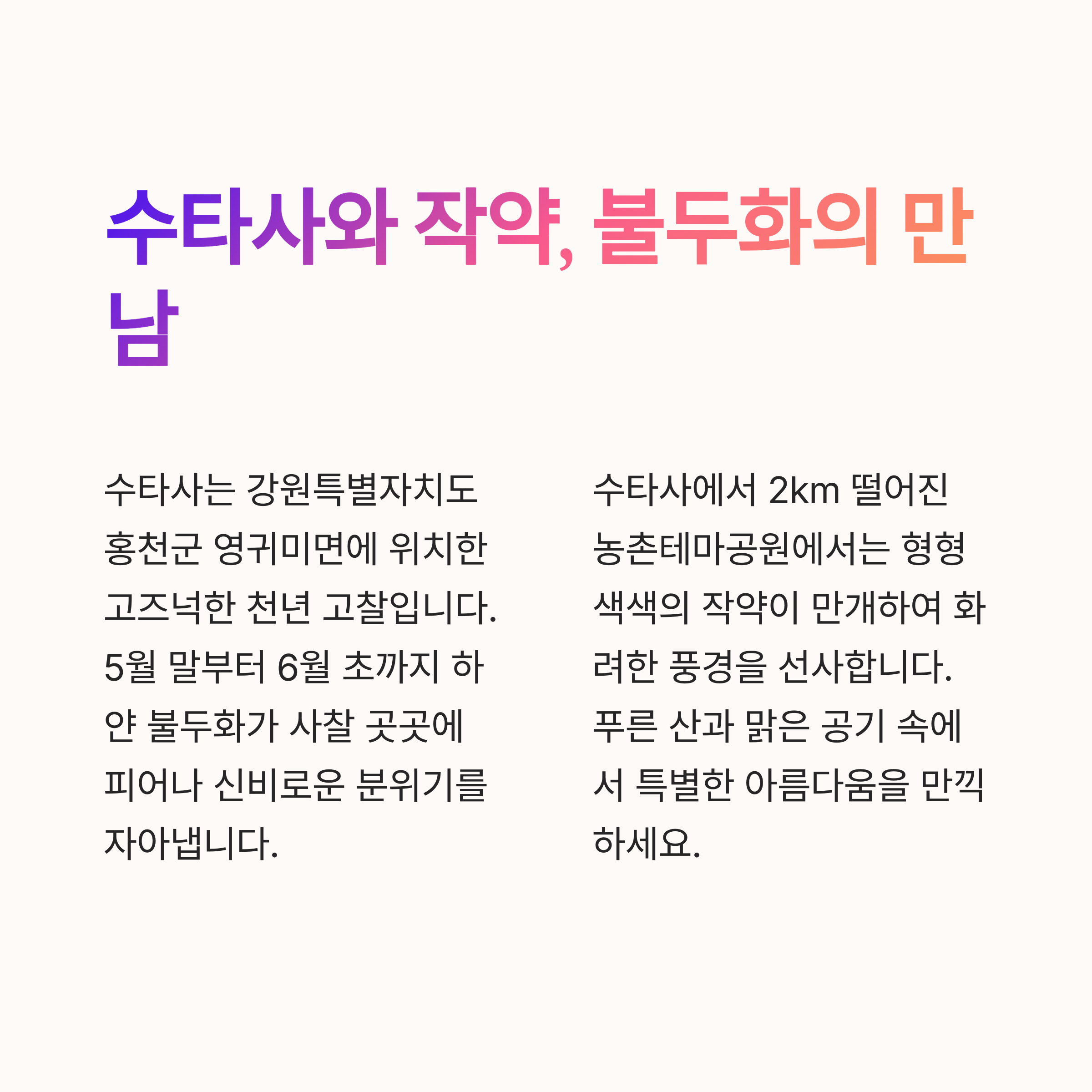 강원특별자치도 홍천군에 위치한 수타사는 천년 고찰의 고즈넉함과 자연의 아름다움이 조화를 이루는 곳입니다. 특히 초여름이면 수타사 경내에는 탐스러운 불두화가 만개하고, 수타사 전방 2km에 위치한 수타사농촌테마공원에서는 화려한 작약꽃이 만발하여 방문객들의 눈길을 사로잡습니다. 싱그러운 계절, 홍천 수타사에서 꽃과 함께하는 힐링 여행을 떠나보는 건 어떨까요?