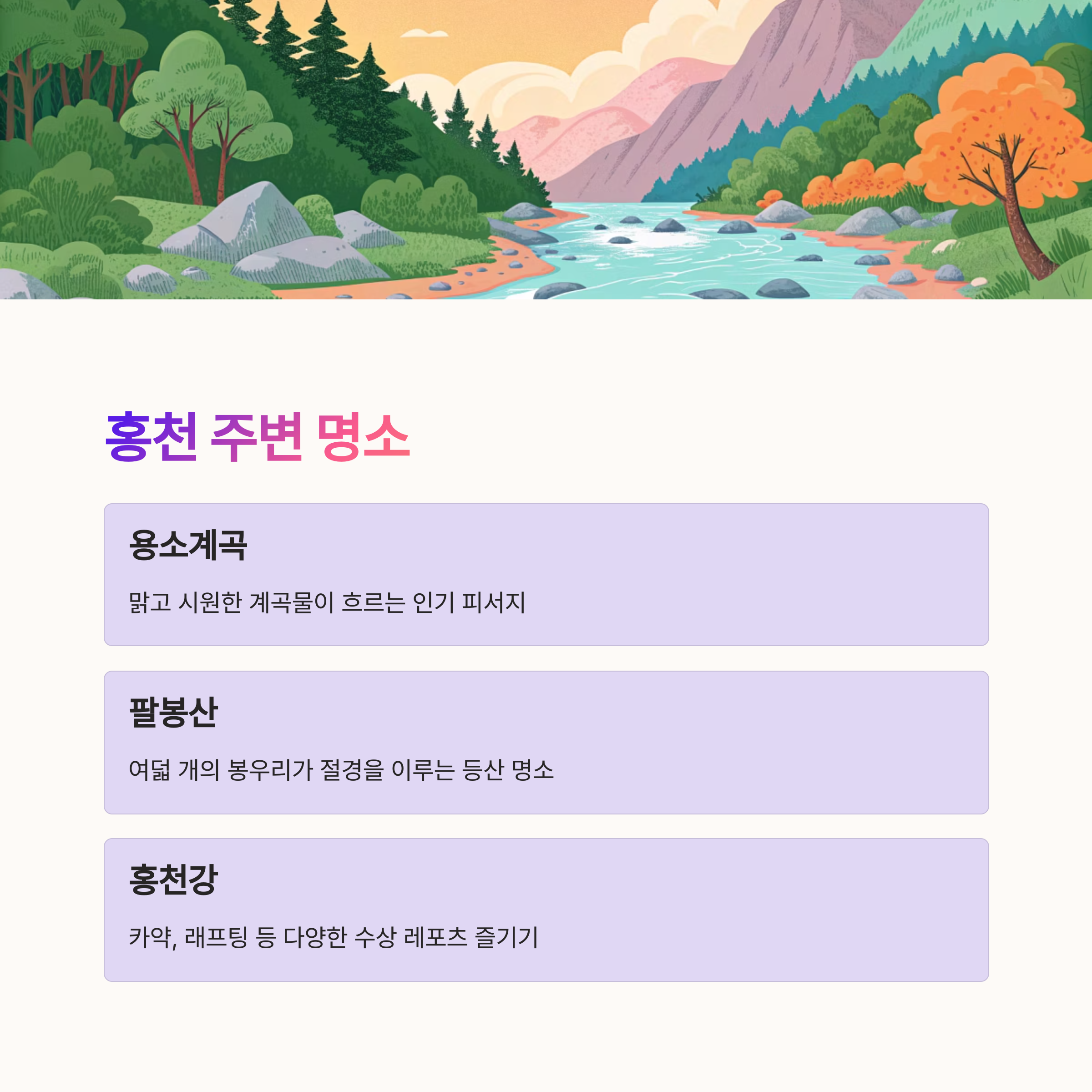 - 🌳 주변 명소: 용소계곡, 팔봉산, 홍천강, 홍천 은행나무숲 등