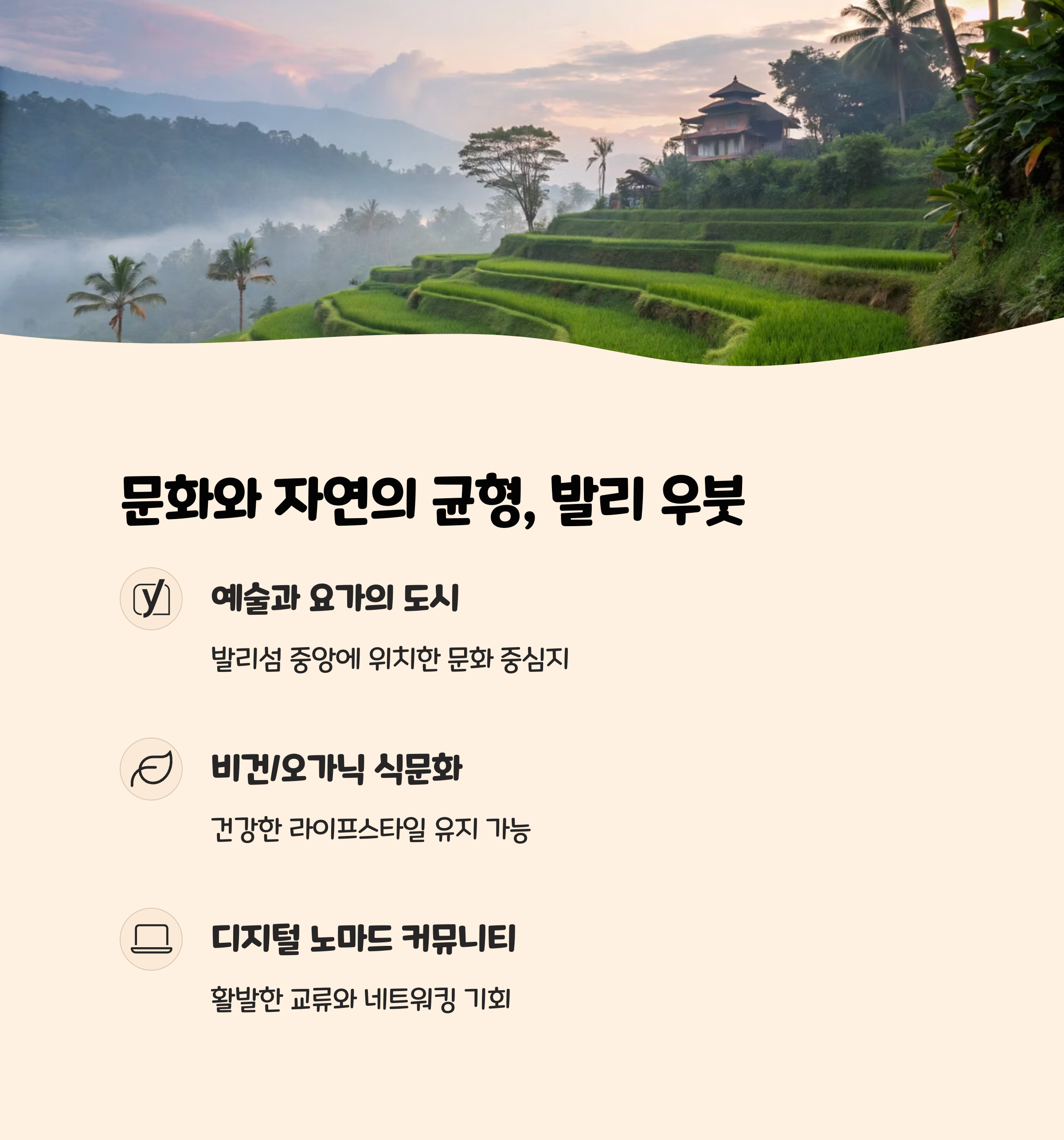 | 요가, 명상, 휴식 | 우붓, 오악사카 | 자연 기반, 느린 삶 |