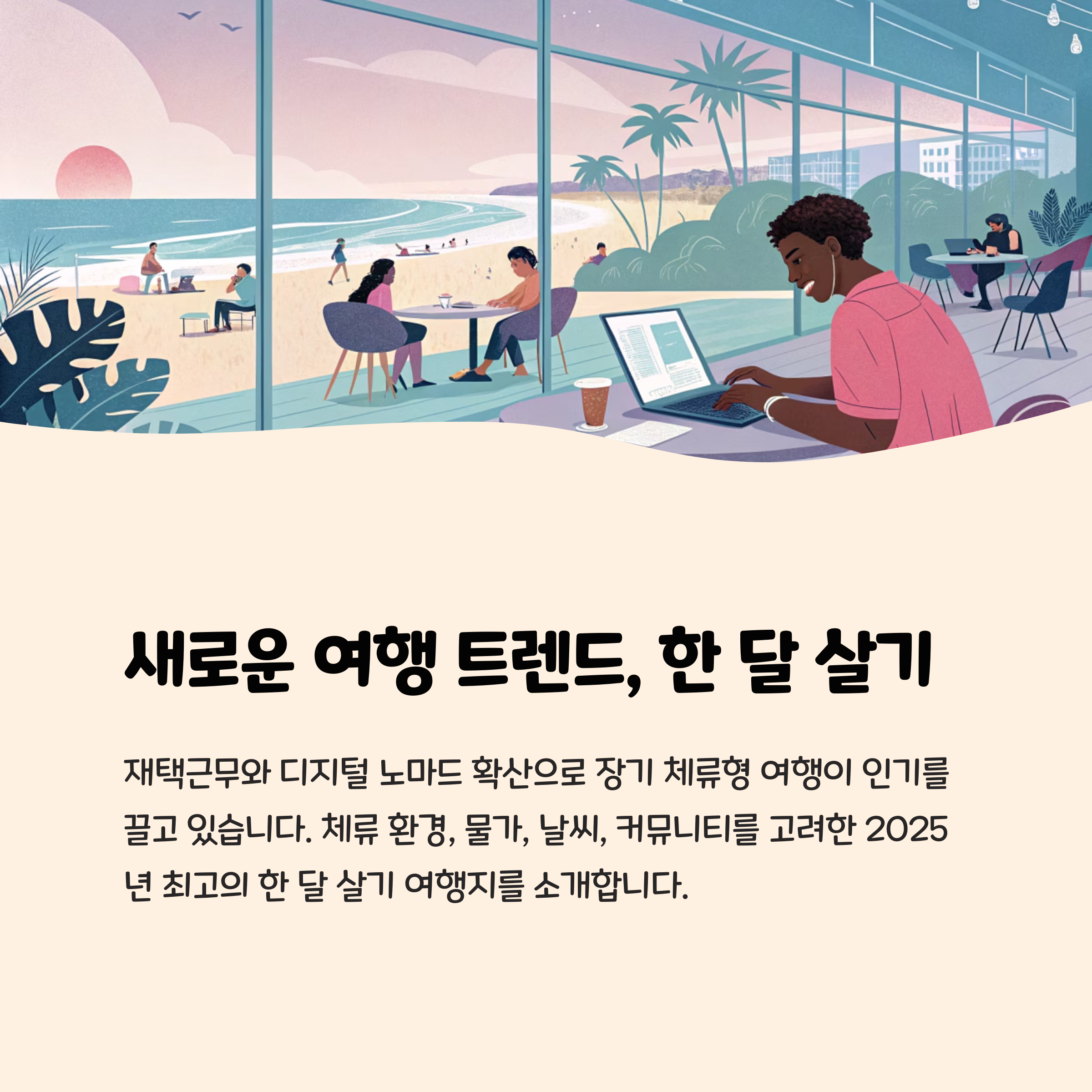 2025년 현재 가장 인기 있는 한 달 살기 여행지 5곳을 선정해, 체류 환경, 물가, 날씨, 커뮤니티 등