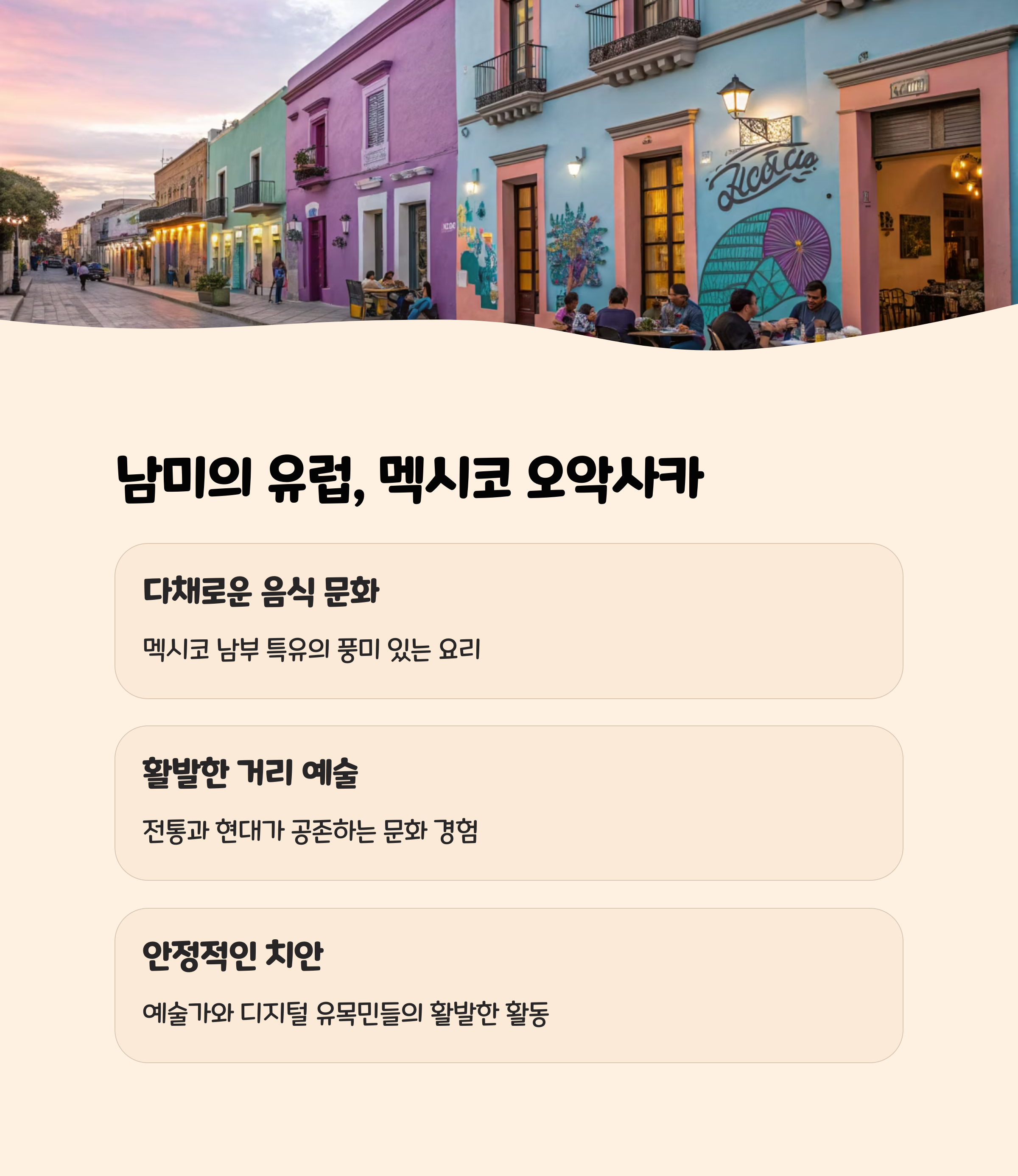 오악사카는 멕시코 남부 내륙에 위치한 전통과 현대가 공존하는 도시입니다.