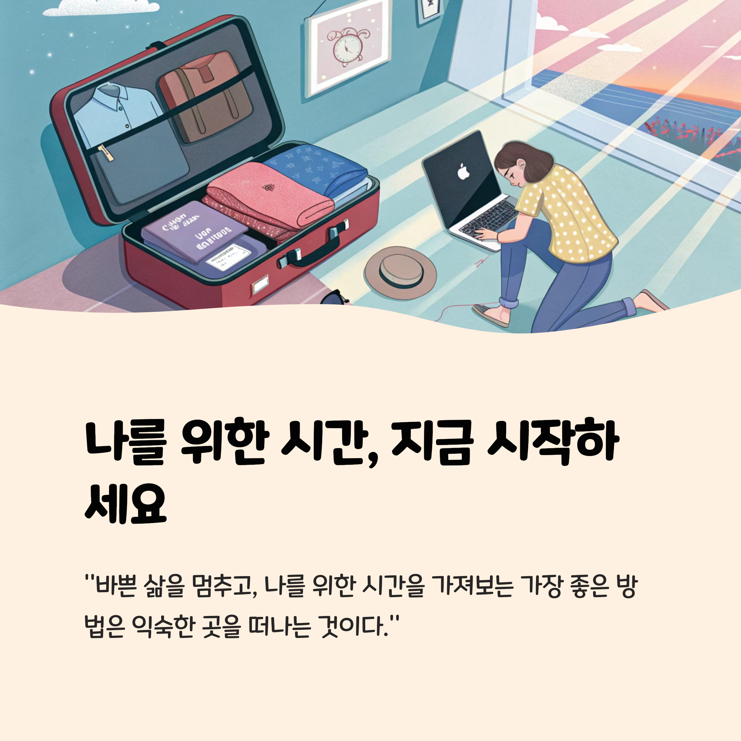 "바쁜 삶을 멈추고, 나를 위한 시간을 가져보는 가장 좋은 방법은 익숙한 곳을 떠나는 것이다."