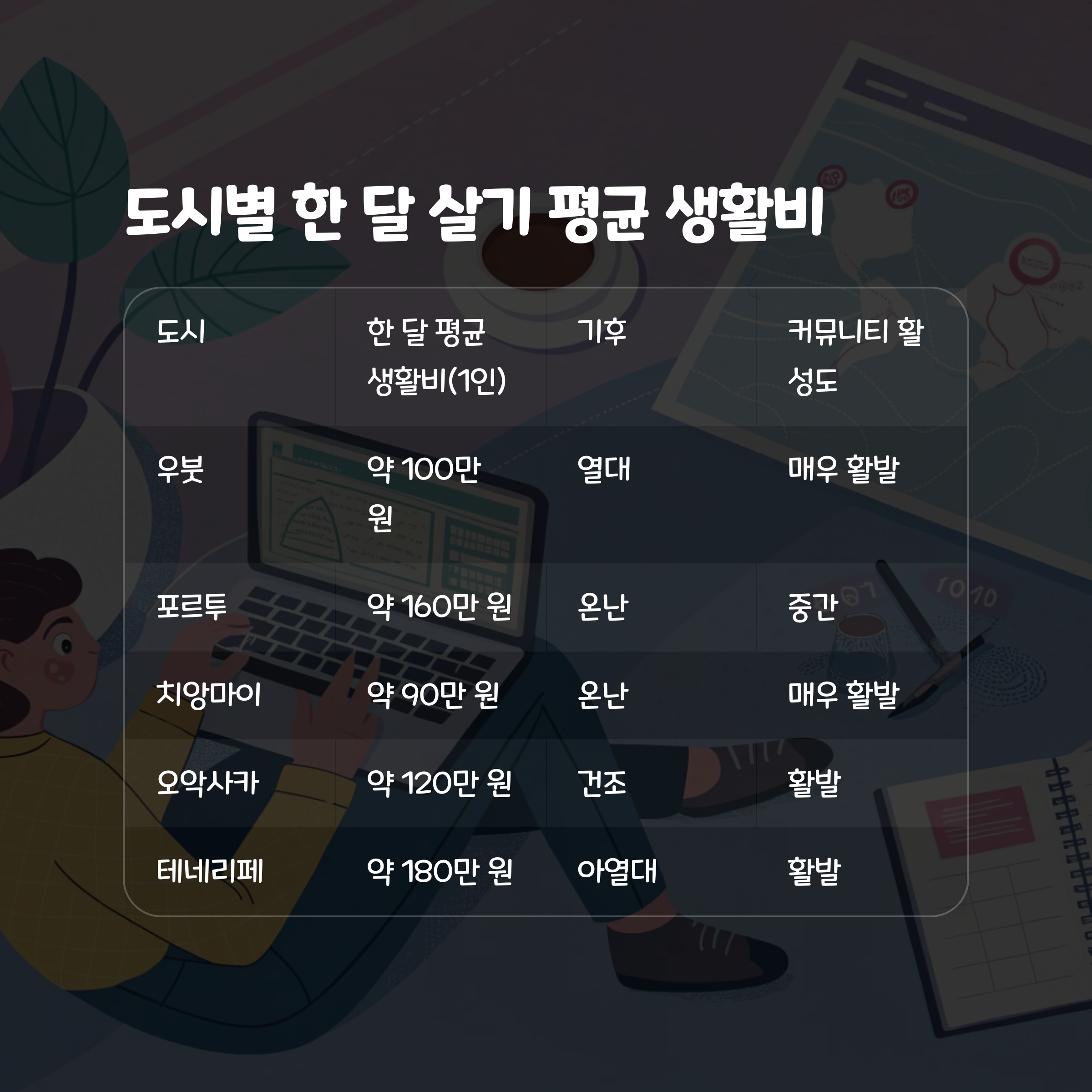 인기 도시별 한 달 살기 평균 생활비