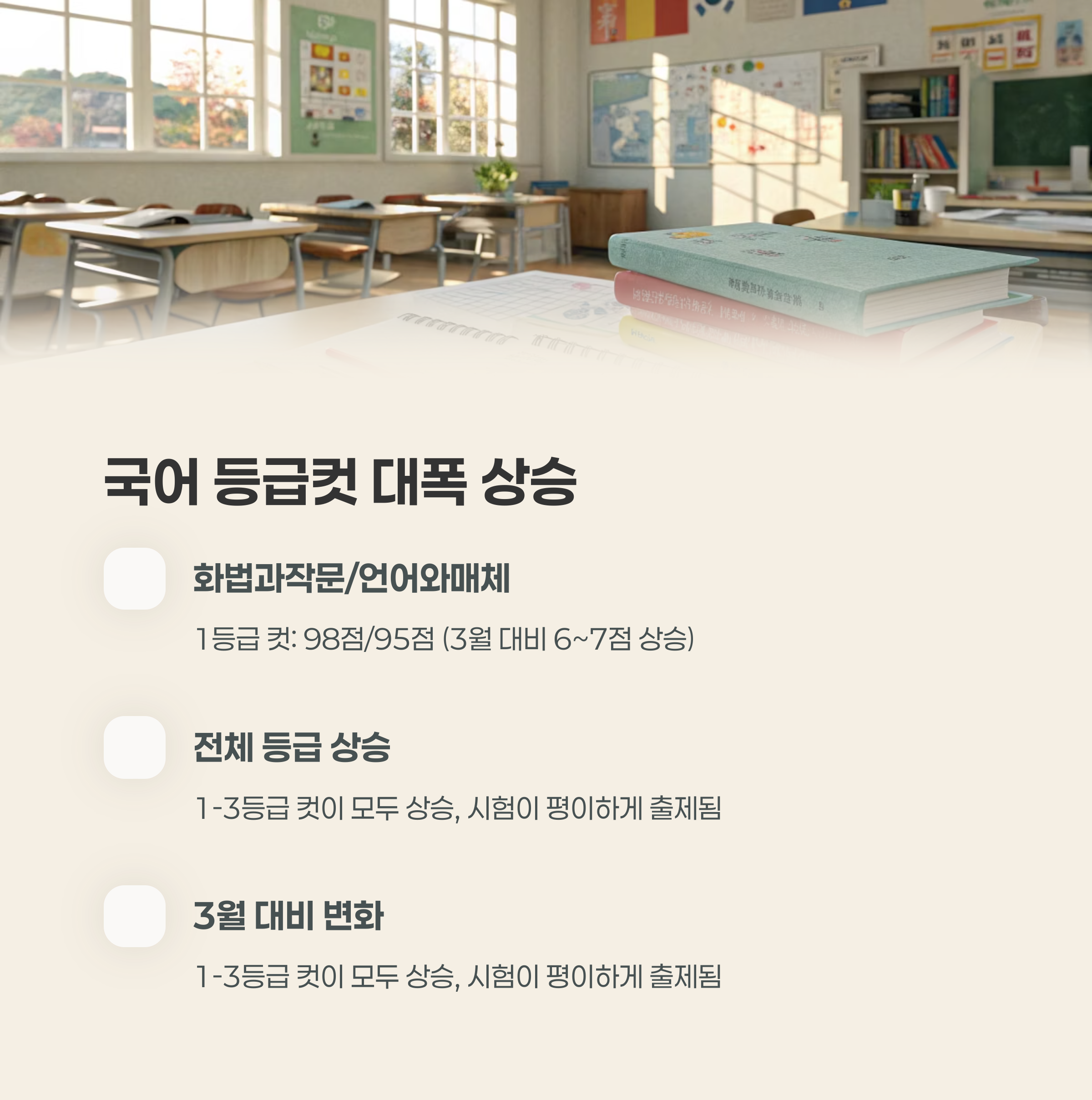 - 화법과작문, 언어와매체 모두 1~3등급 컷이 3월 모의고사보다 6~7점 상승했습니다.