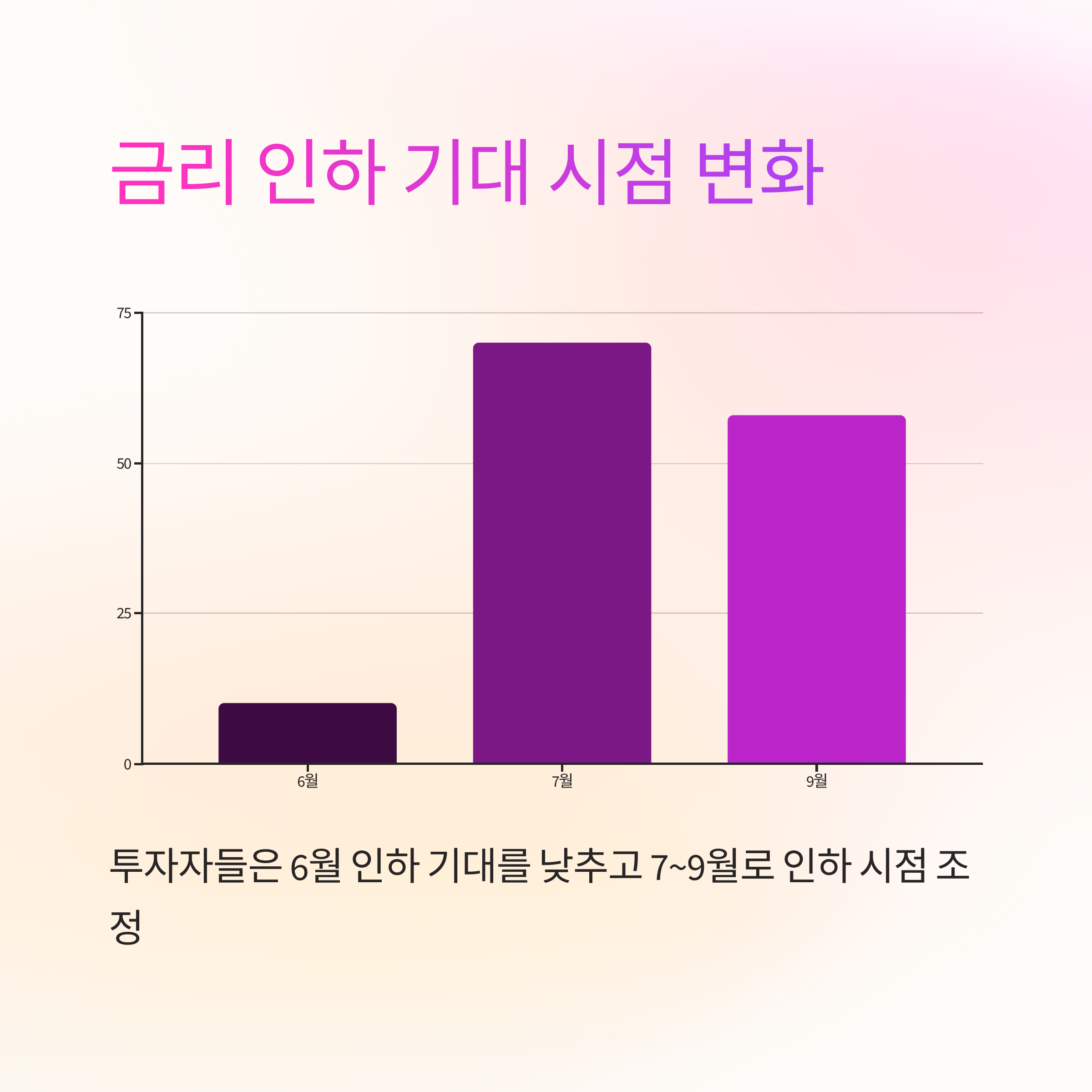 투자자들은 6월 금리 인하 기대를 대폭 낮추고, 7월~9월로 인하 시점을 미루는 분위기입니다. 7월 인하 가능성을 70% 이상으로 반영하기도 했으나, 일부는 9월 50bp 인하 가능성까지 언급하고 있습니다.