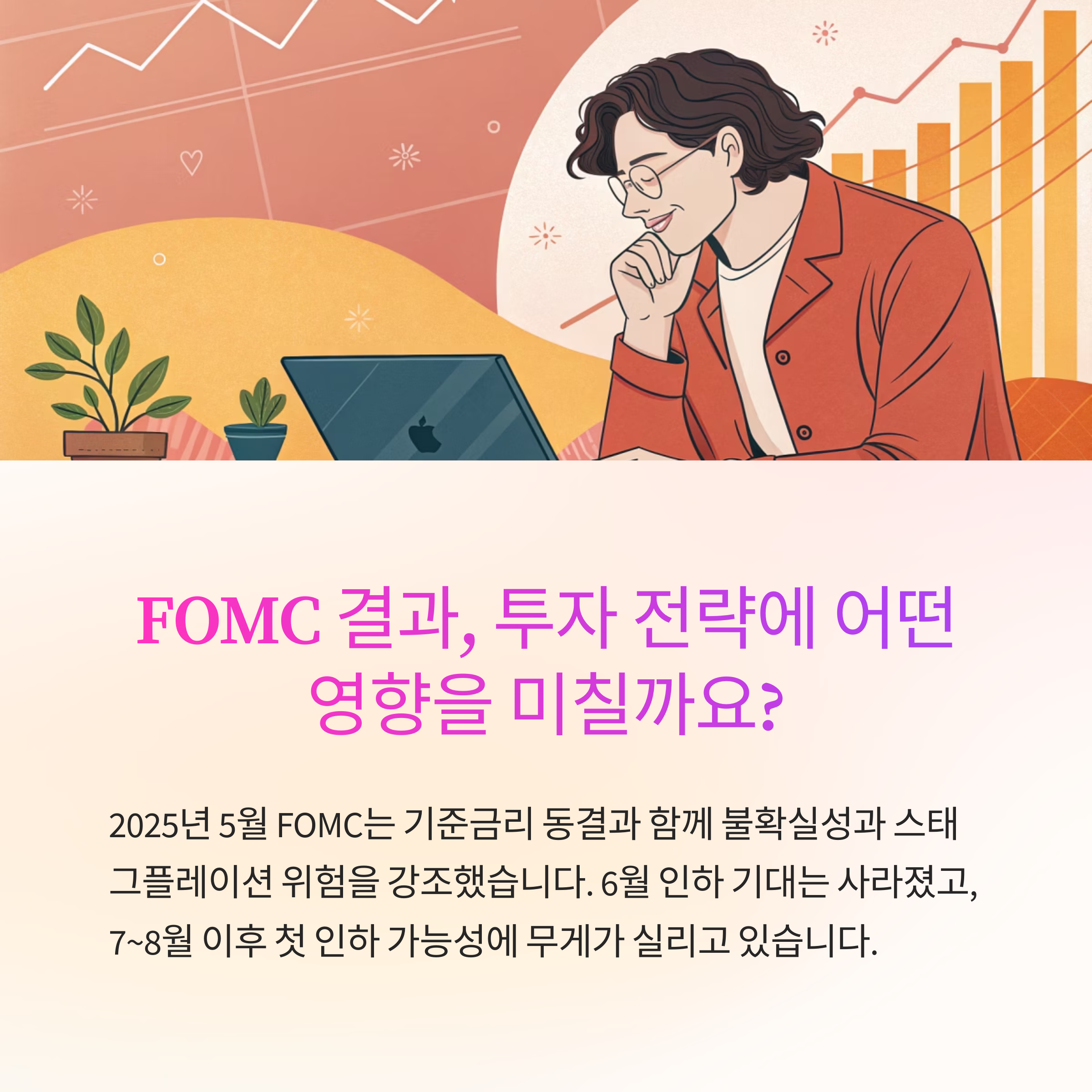 2025년 5월 FOMC는 기준금리 동결과 함께 불확실성·스태그플레이션 위험을 강조하며 신중한 관망 기조를 재확인했습니다. 6월 금리 인하 기대는 사실상 사라졌고, 연준은 경제지표와 대외 변수의 명확한 변화가 있을 때까지 정책 변화를 유보할 전망입니다. 시장은 7~8월 이후 첫 인하 가능성에 무게를 두고 있으며, 투자자들은 당분간 보수적 전략을 유지할 필요가 있습니다.