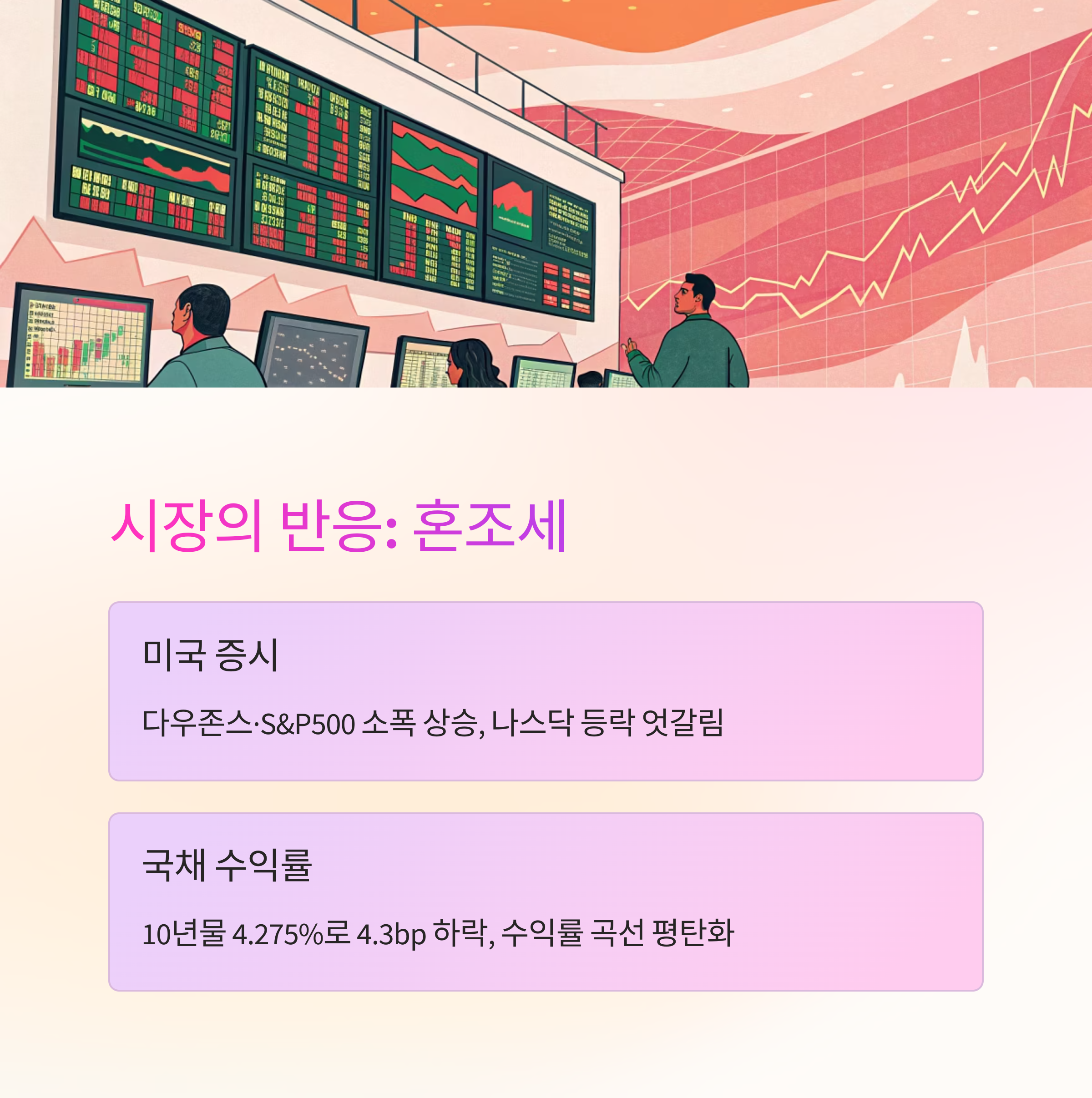 국채 수익률은 하락(10년물 4.275%로 4.3bp 하락), 장단기 금리차는 축소되어 수익률 곡선이 평탄화되는 모습이 나타났습니다.