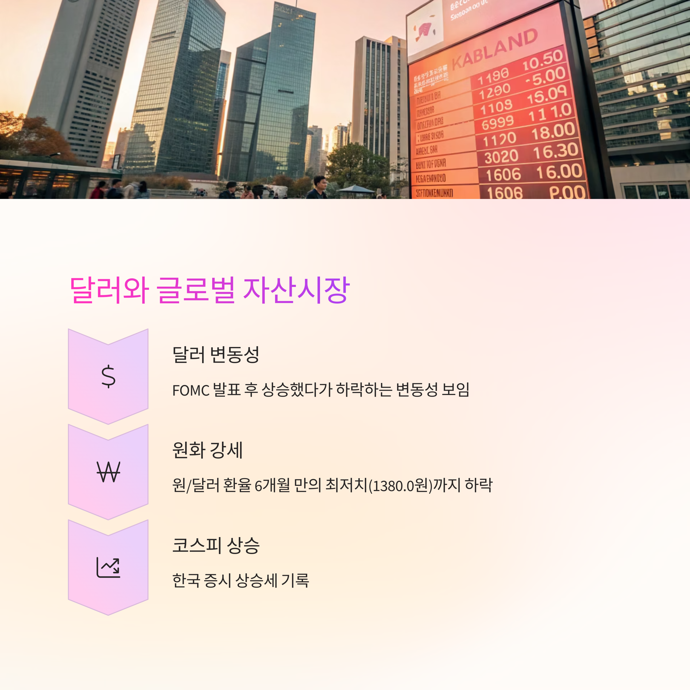 FOMC 발표 직후 달러 가치는 상승했다가 다시 하락하는 등 변동성을 보였습니다. - 원화 강세, 코스피 상승