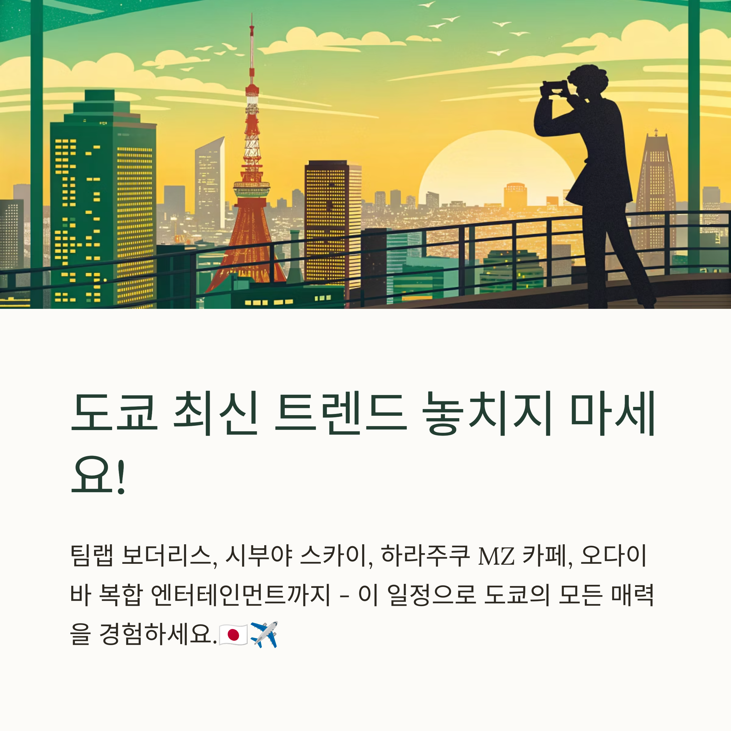 이 일정으로 일본 초행길 여행자도 도쿄의 다양한 매력과 최신 트렌드를 모두 체험할 수 있습니다.