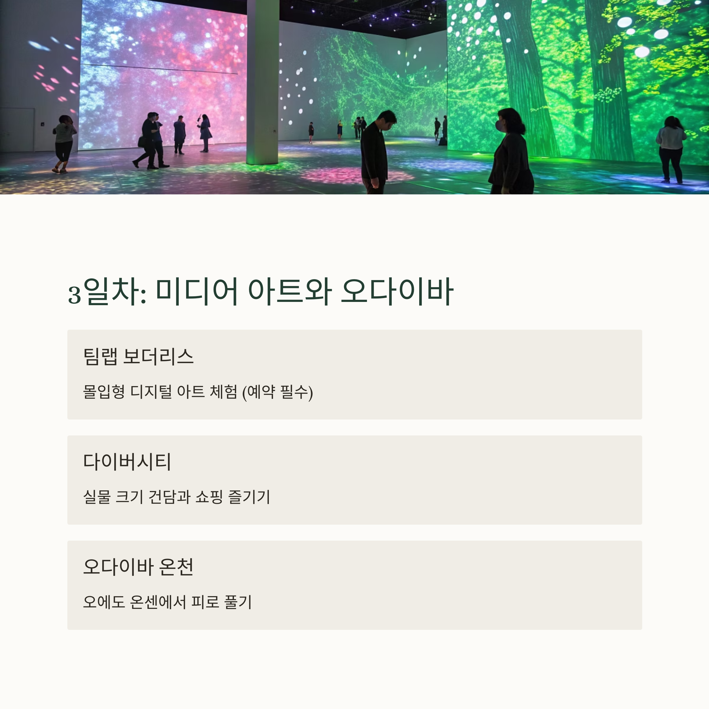 | 3일차 | 미디어아트 & 오다이바 | 팀랩 보더리스, 오다이바, 쇼핑, 야경, 온천 |