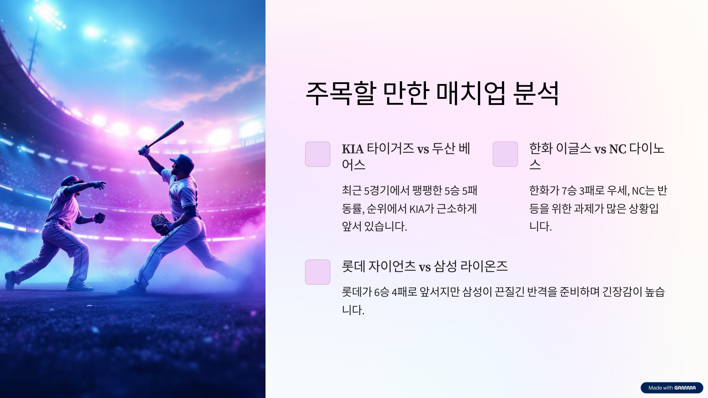 - 핵심: 좌완·우완 매치업 따라 타선 라인업 스플릿 활용이 중요.