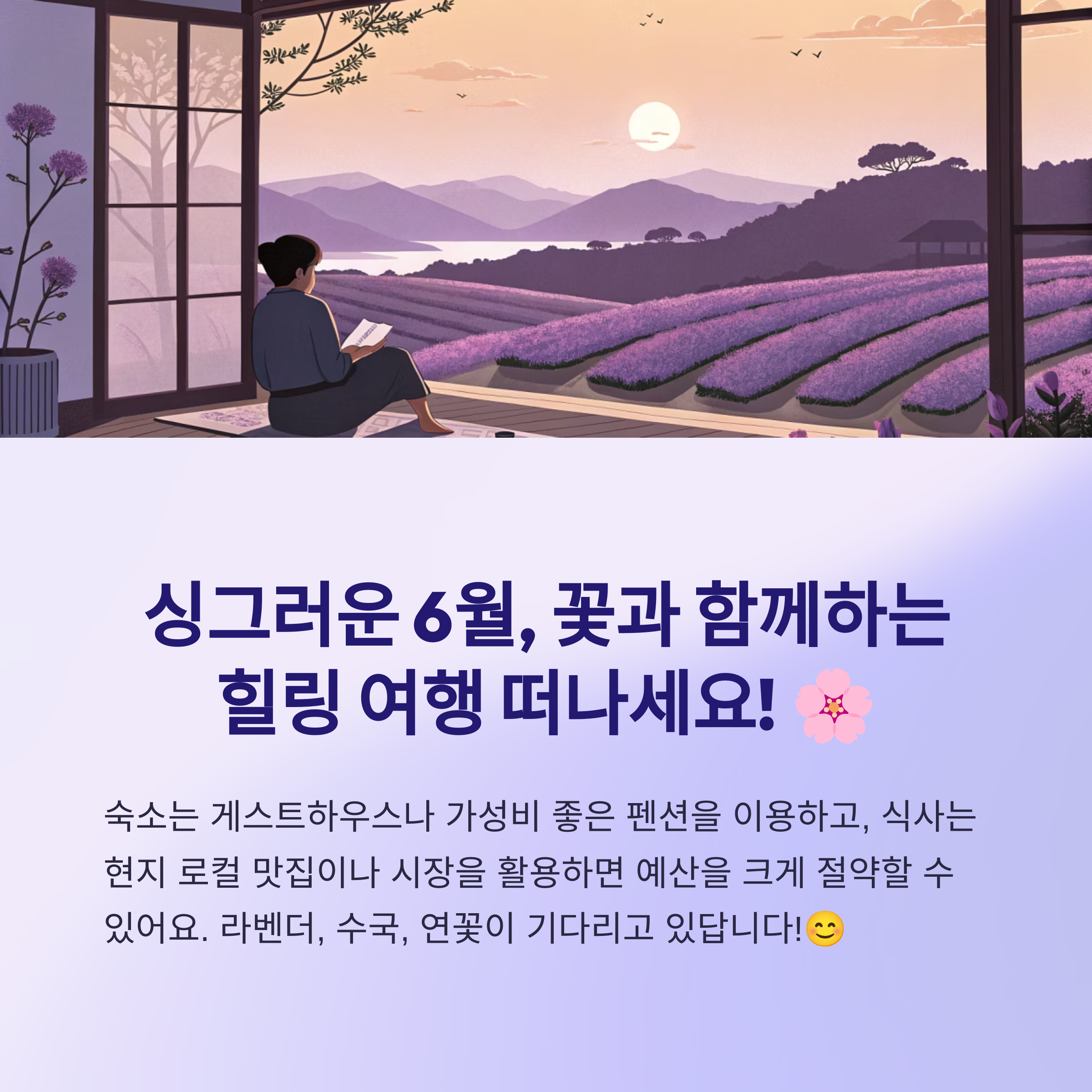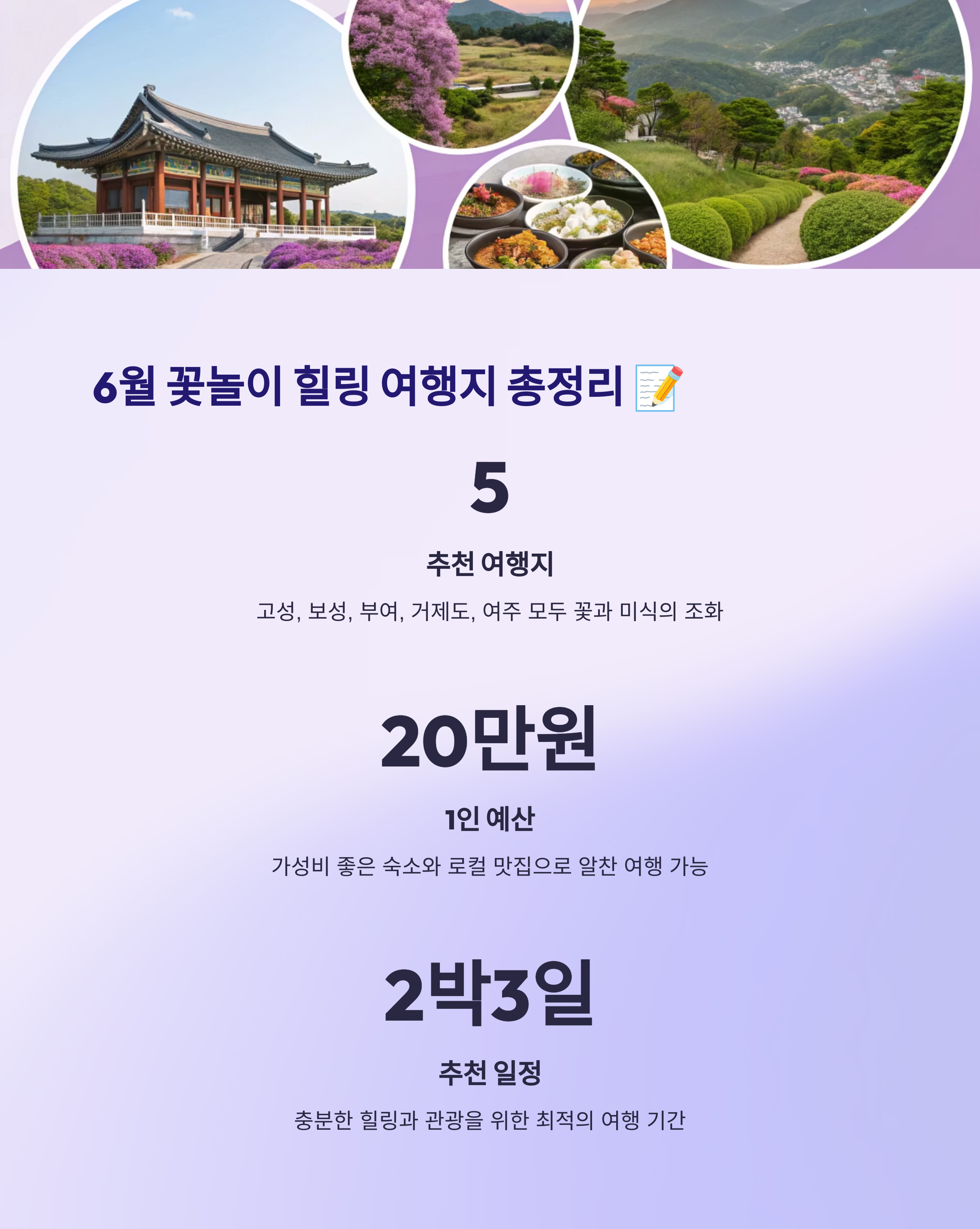 6월, 1인당 20만원 미만으로 2박 3일의 국내 제철 꽃놀이 및 미식 힐링 여행을 떠나고 싶으신가요? 위에 추천해 드린 5곳은 아름다운 꽃 풍경은 물론, 몸과 마음을 치유할 수 있는 자연환경과 맛있는 현지 음식까지 겸비한 최고의 여행지라고 생각해요!