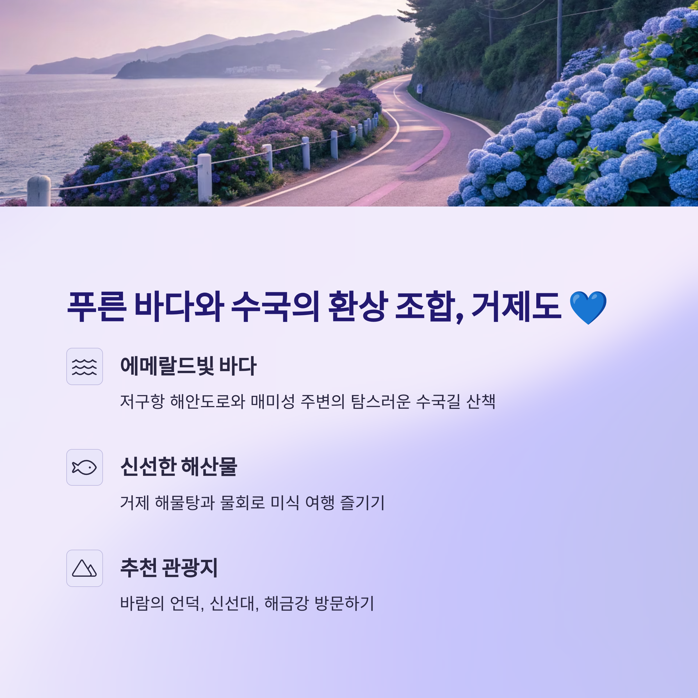 - 이용 후기: "수국 가득한 해안도로를 따라 드라이브하는 내내 행복했어요. 싱싱한 해산물은 말할 것도 없고요! 거제는 바다만 봐도 힐링입니다."