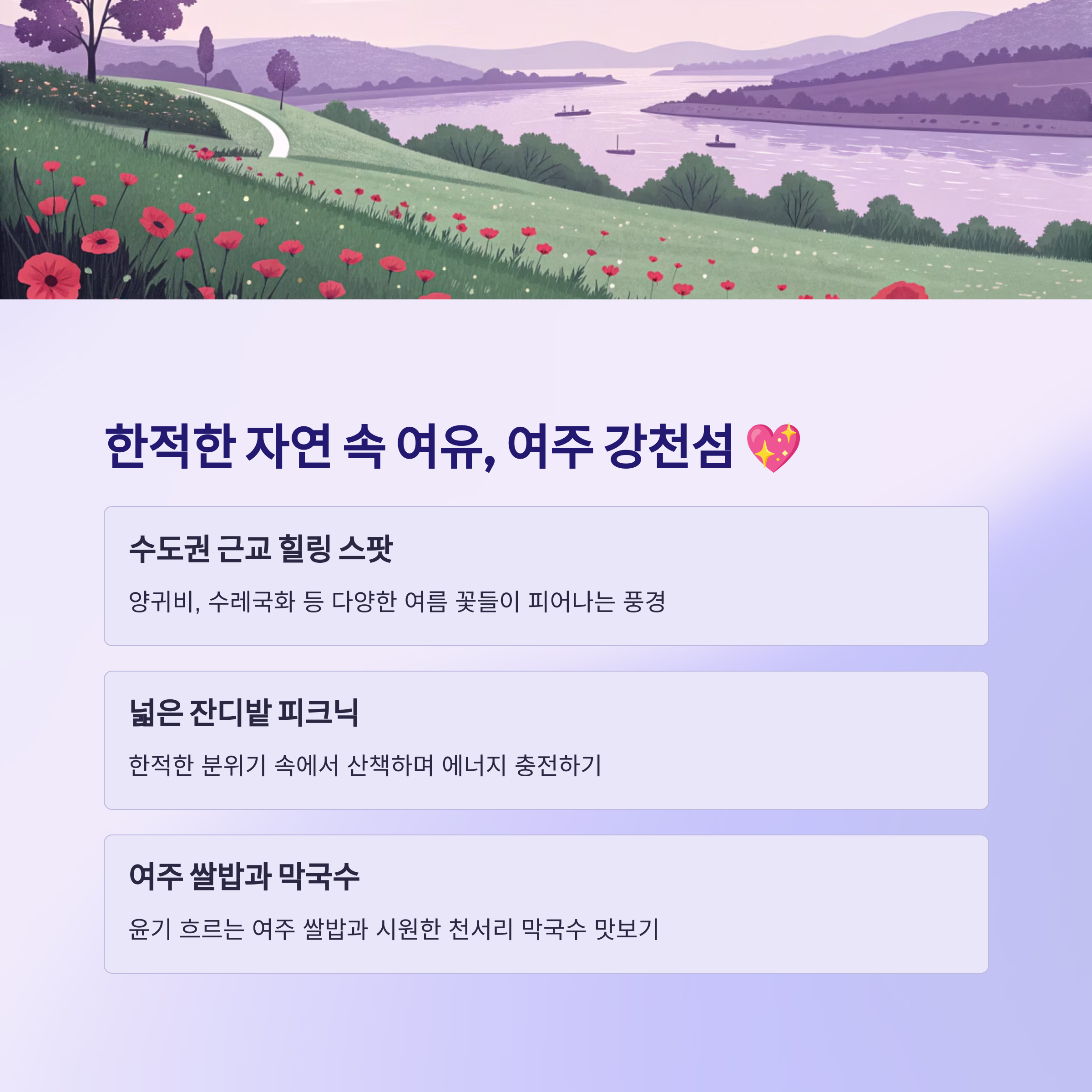 수도권에서 멀지 않으면서도 자연 속에서 온전한 힐링을 누리고 싶다면 경기도 여주를 추천해요. 강천섬은 6월에 양귀비, 수레국화 등 다양한 여름 꽃들이 피어나 아름다운 풍경을 선사하고, 넓은 잔디밭에서 피크닉을 즐기기에도 좋아요. 한적한 분위기 속에서 산책하며 에너지를 충전하기 딱이죠! 🧘♀️ 또한, 아름다운 남한강변에 위치한 신륵사도 고즈넉한 멋이 일품이랍니다.