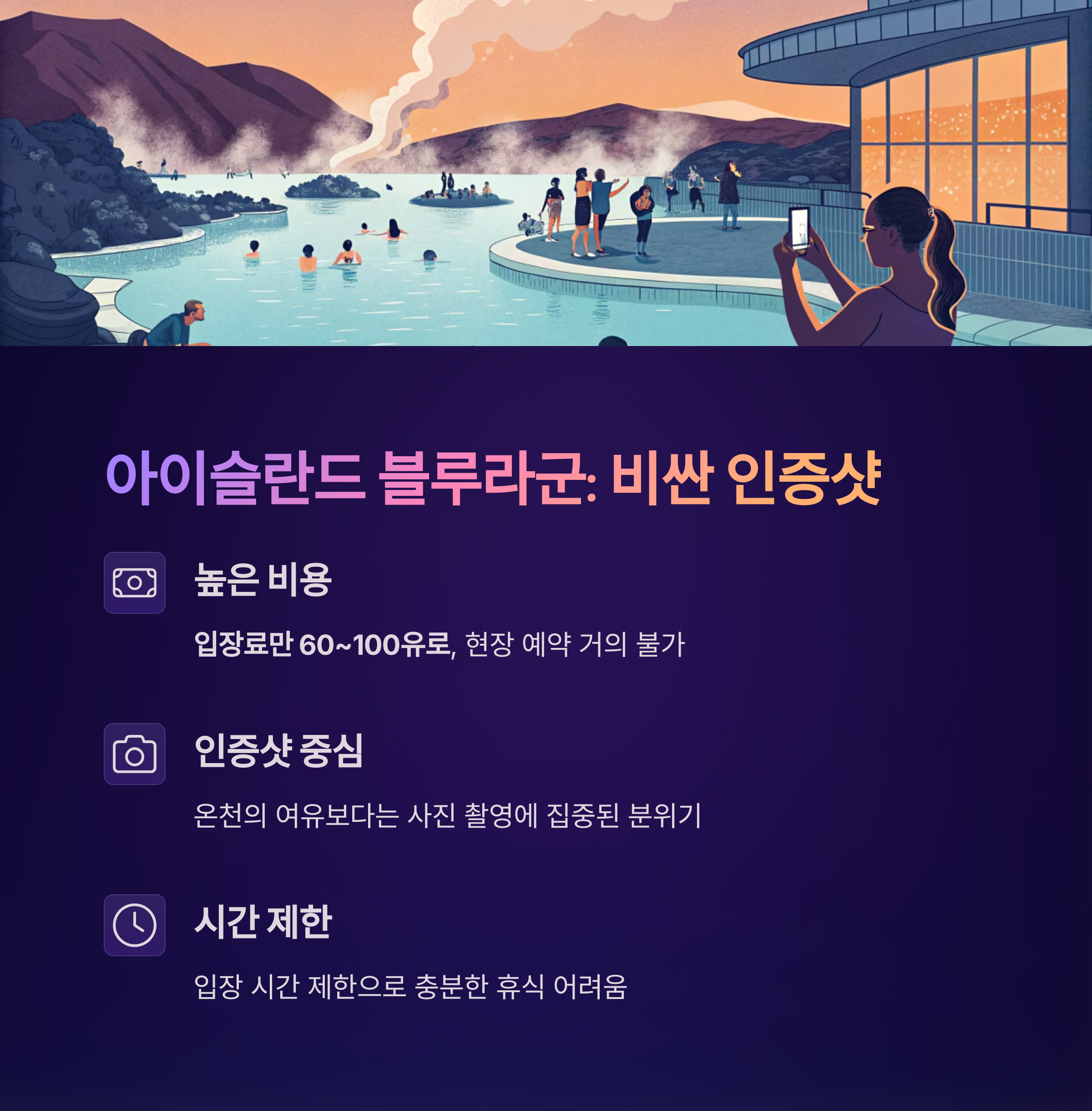 천연 온천 같은 이미지로 SNS에 자주 등장하는 블루라군은 입장료만 60~100유로에 달하며,